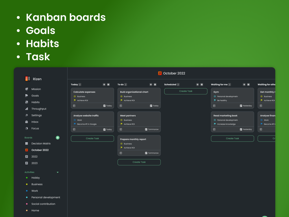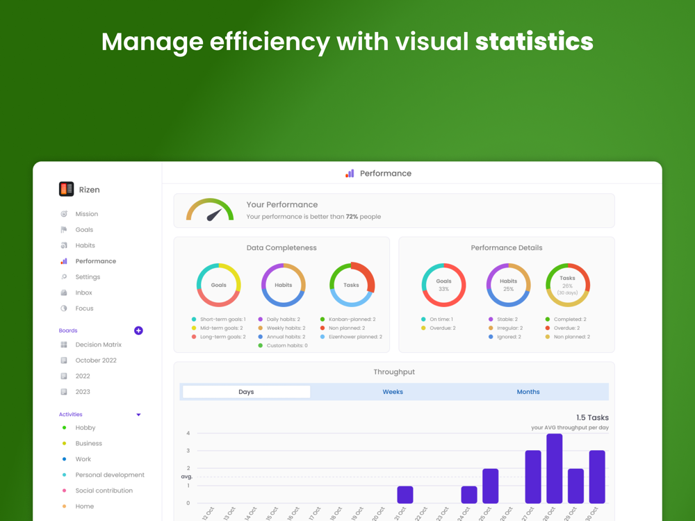 ◆ The Rizen App was built on the famous Japanese productivity philosophy Kaizen. The concept of Kaizen improves everyday procedures, making tasks and achieving goals more fulfilling, less tiring, and more productive.