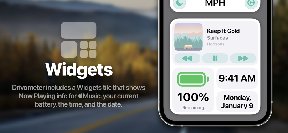 The interface is simple and intuitive, designed to minimize distraction while driving. Convenient widgets show you Now Playing info*, your current battery percentage, the current time, and the date. The interface also auto-rotates so you can use Drivometer in portrait or landscape.