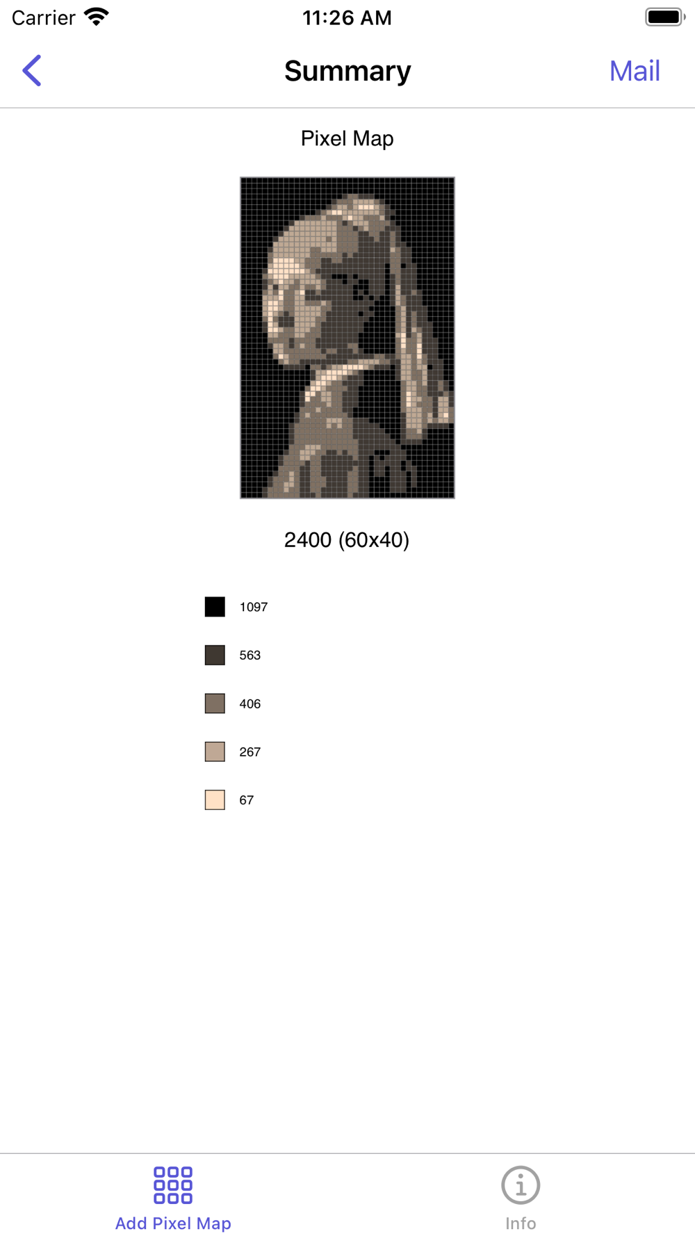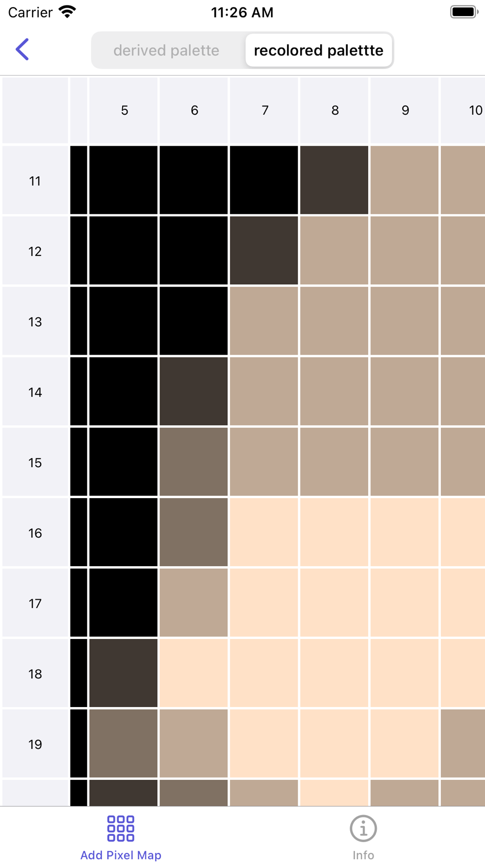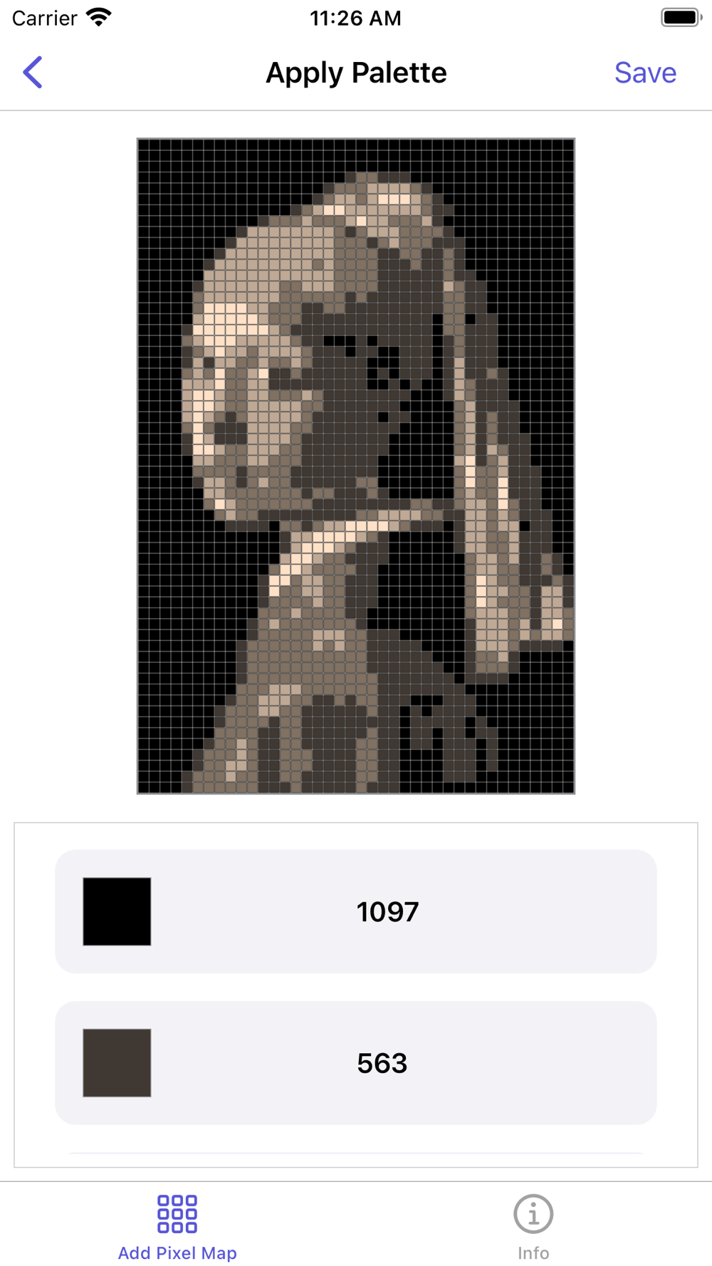 In Pixel Map you can select one of your own photos as the basis for a pixel map. Also, you can select the number of pixels to be used for your Pixel map (the app generates pixel map samples based on the original colors and the aspect ratio of your photo), and you can compose your own palettes by selecting colours from two separate sets of color patches.