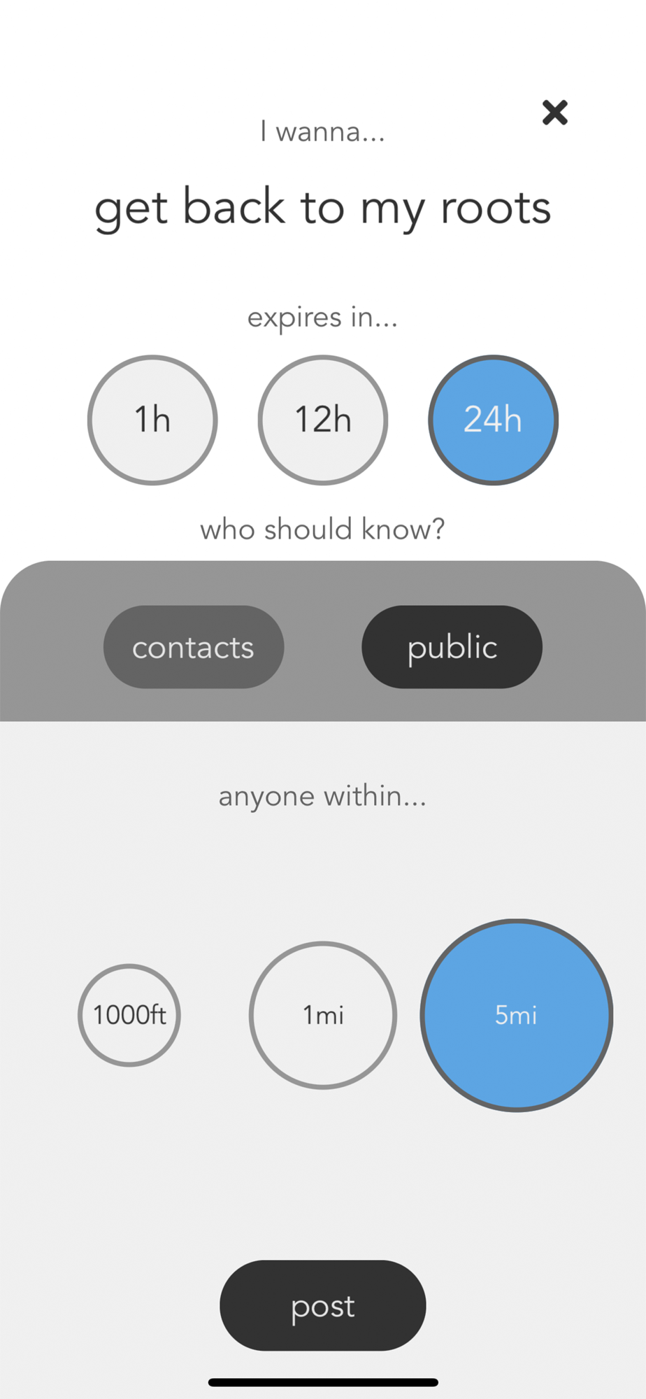 - Post only to friends, or to new people near you