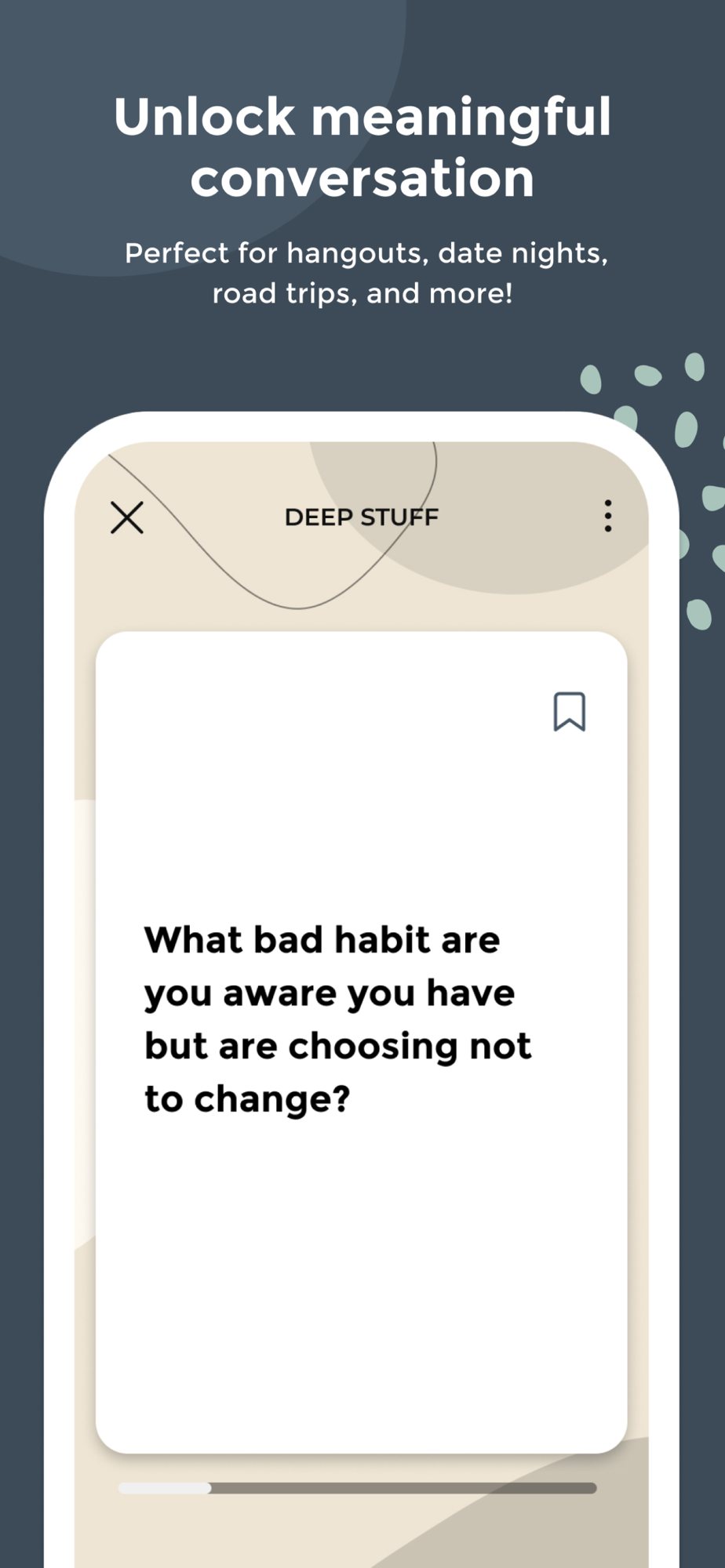 - Deep Stuff - 50 prompts to cut through the fluff and get to know one another on a whole 'nother level.