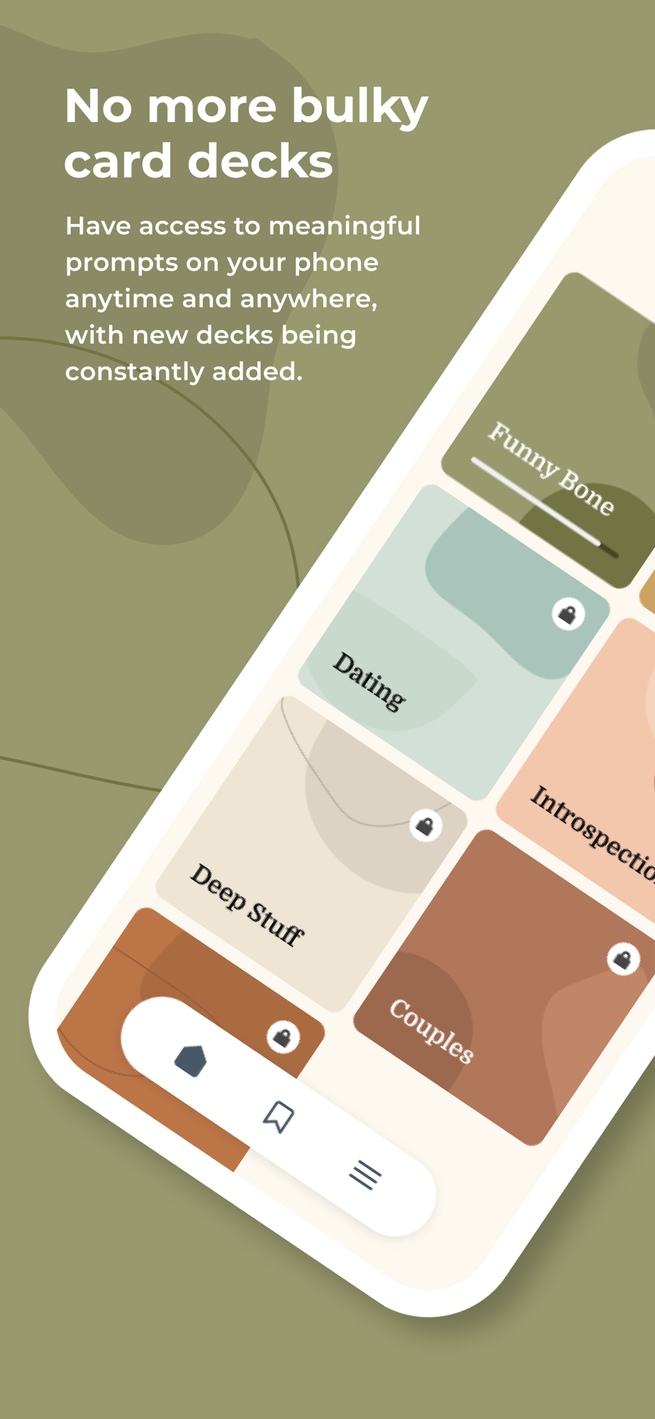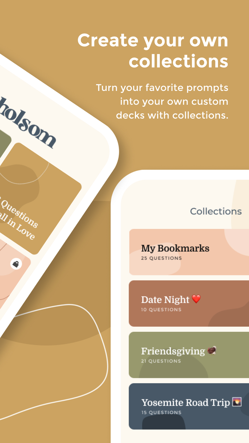 Turn your favorite prompts into your own custom decks with collections. Once you own a deck, every question will be able to be added to your library of collections.