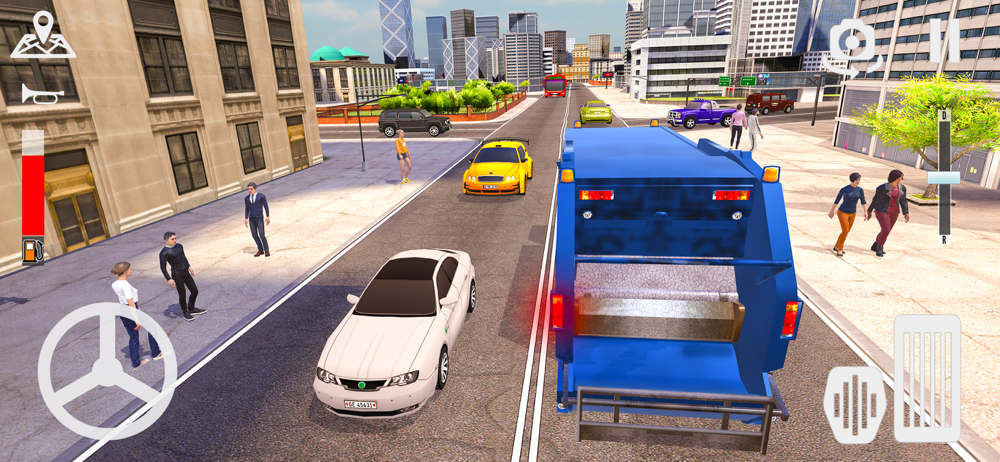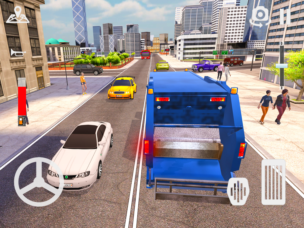 There are different options for control and driving big trash truck. There are many trucks in the game each having its own mechanics and animations. Most advance trucks can collect dustbins from the roads with proper animations and dump its trash in the trucks. In this real garbage truck games you have to pick garbage containers from main city buildings like supermarket, hospital, parking plaza shopping mall and food restaurants etc to replace garbage disposal in recycling unit.