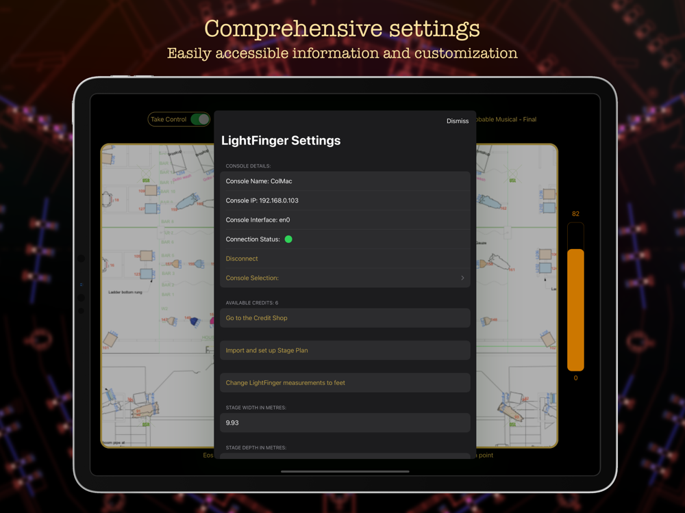 Enter LightFinger… select the channel you want to control and your screen accurately maps the moving light on stage to the screen. You can control intensity and beam position with the app or simultaneously through the console.