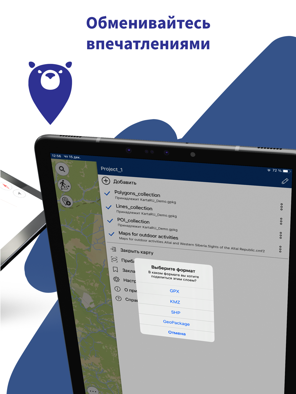 Поделитесь с друзьями и коллегами впечатлениями после путешествий! Обменивайтесь данными о ваших треках и точках наблюдения в популярных форматах: GPX, KMZ/KML и GeoPackage. Используйте мессенджеры, электронную почту или файловые хранилища, чтобы поделиться информацией.