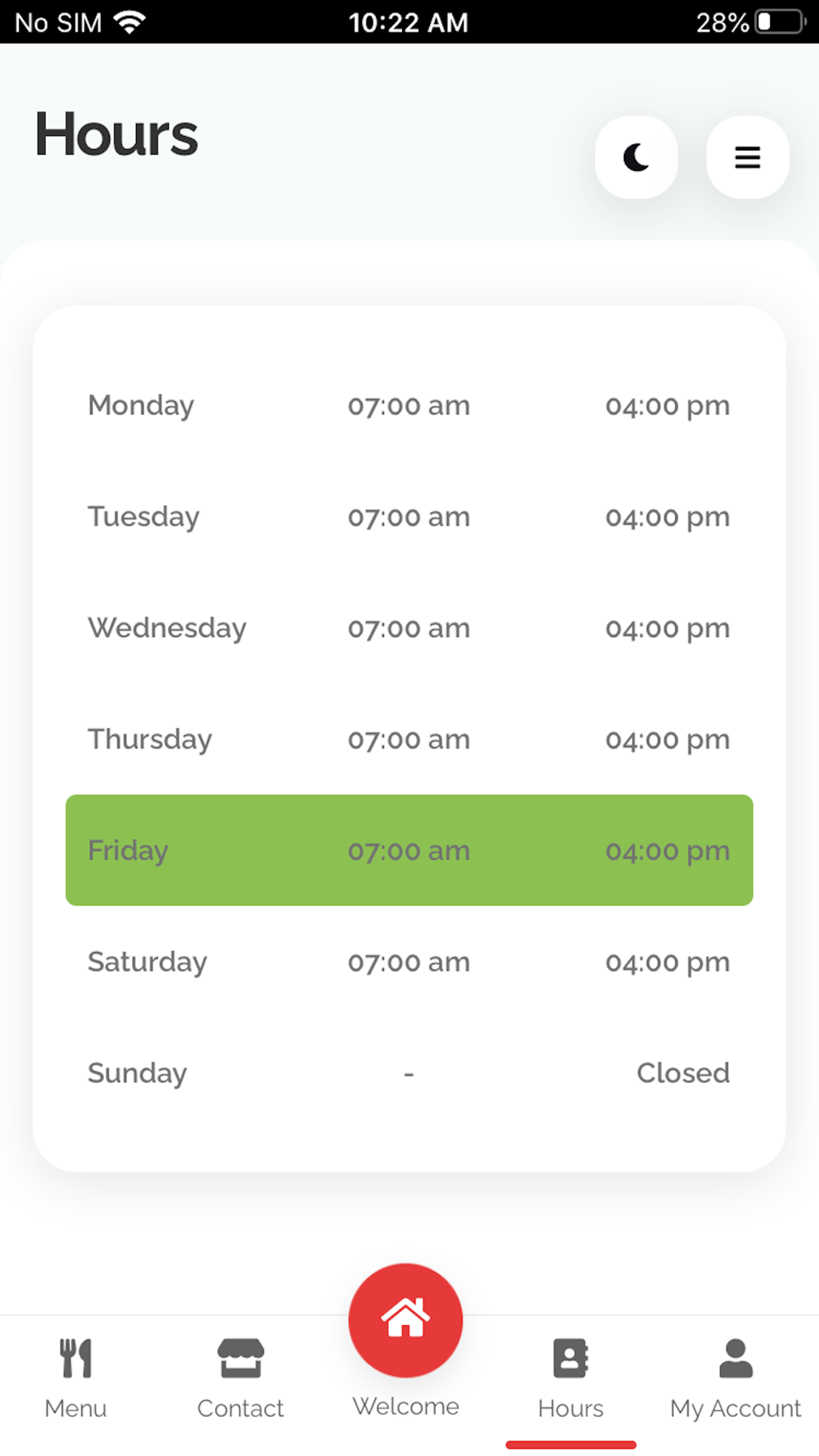 Receive loyalty points. Use points towards future orders. Mark your order as favorite and see them in your profile. Re-order from your order history or favorite orders with a simple click. Use the app in night and day mode.