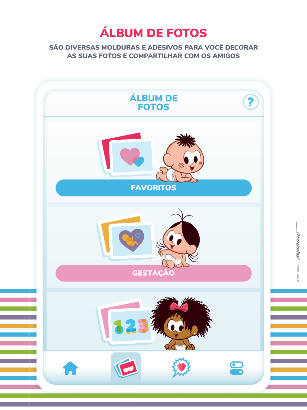 Com o Álbum de Fotos você pode guardar as maiores aventuras do seu bebê com a ajuda da Turminha. São diversas molduras e adesivos para você decorar as suas fotos e compartilhar com a família e amigos.