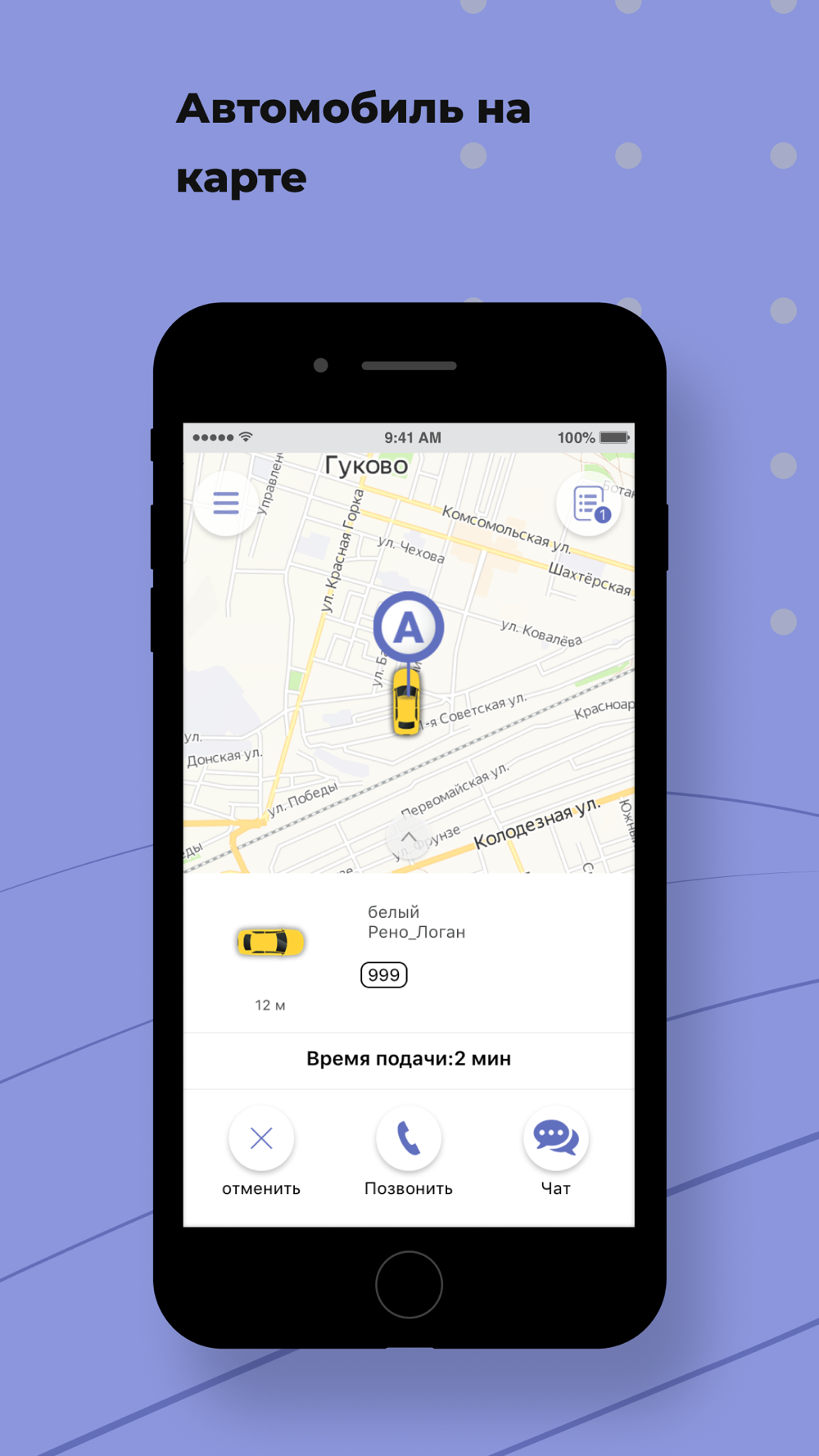 Ты всегда видишь на экране полную информацию о заказе: время подачи, марка, цвет и номер машины, имя водителя.