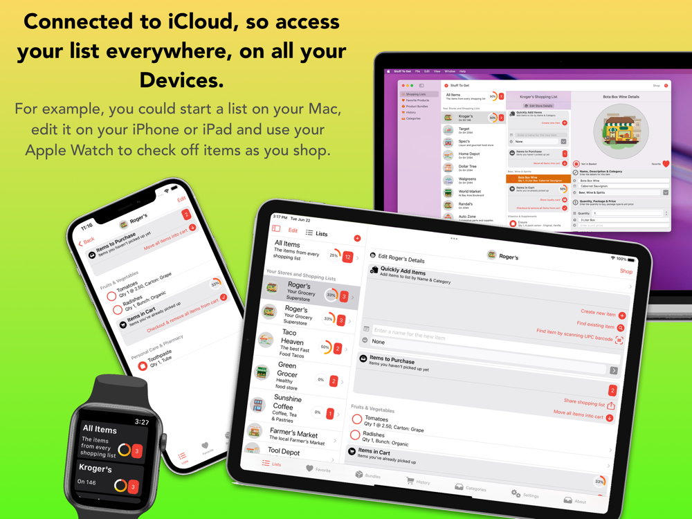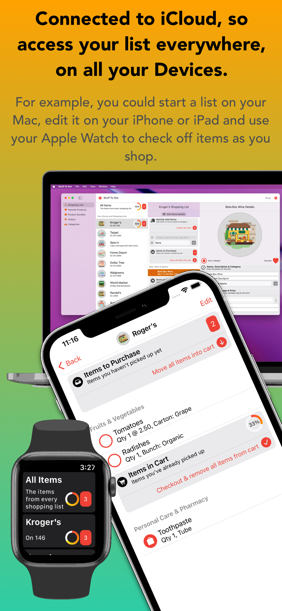 That means you could start a list on your Mac, edit it on your iPhone or iPad and use your Apple Watch to check items off the list as you shop. Stuff To Get will always keep everything in sync.