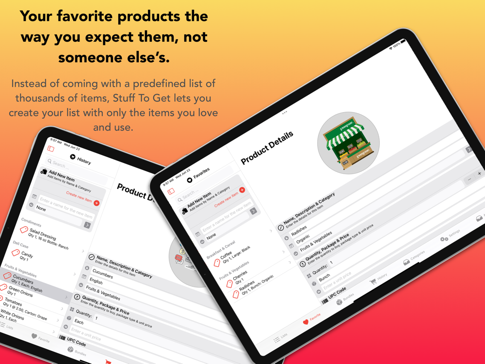 Every time you add or edit a Product, Stuff To Get will remember it so you can quickly add it to any Shopping List in the future. In no time, you'll build up the list of your Products, done your way.