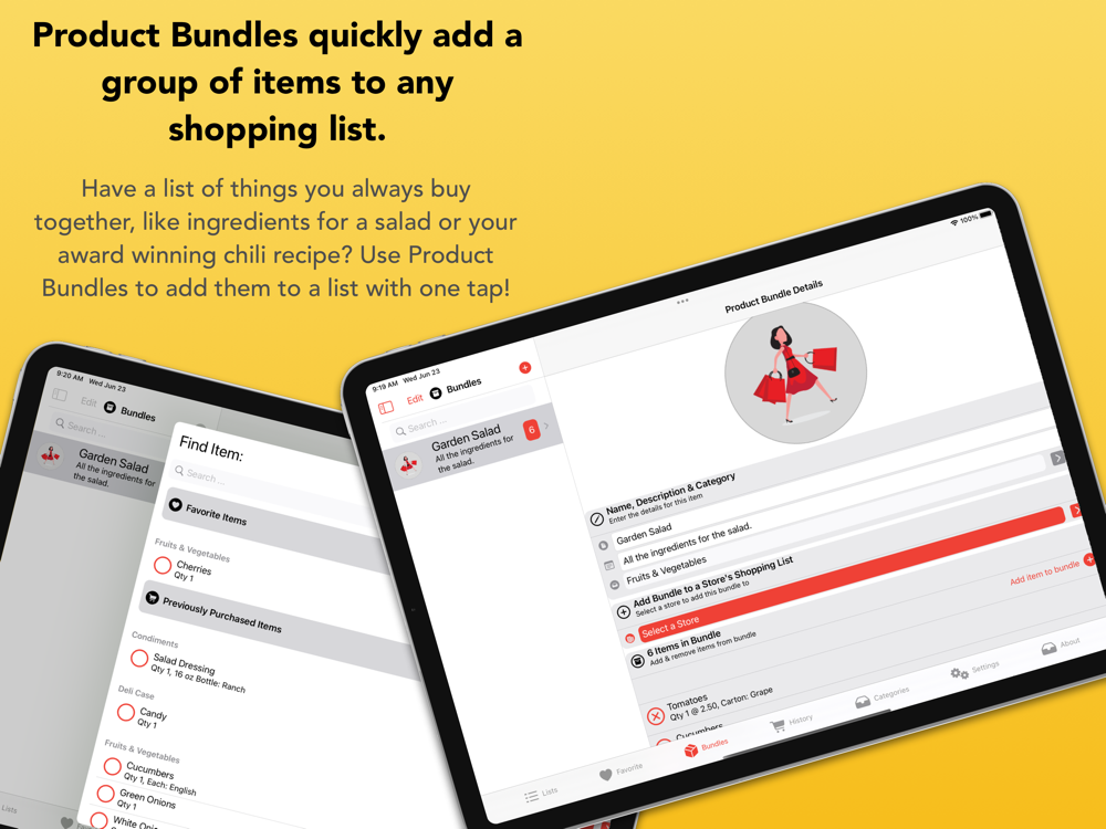 Have a list of things you always buy together, like ingredients for a salad or your award winning chili recipe? Create a Product Bundle and you can quickly add all of the Items in the Bundle to any Shopping List with a single tap.