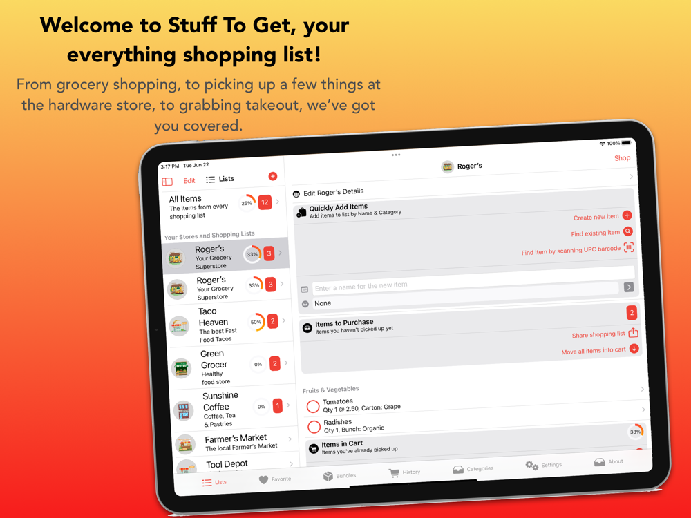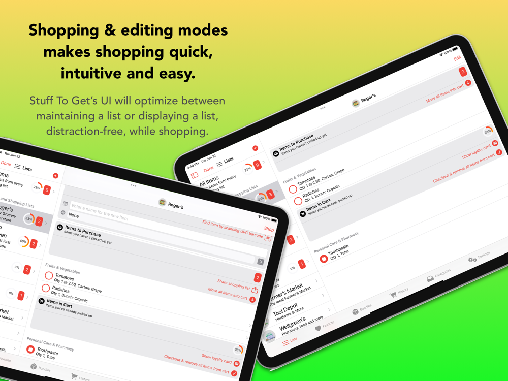 Stuff To Get is so much more than just a simple grocery list manager, it can handle any type of Shopping List you throw at it. Letting you keep all of your shopping trips neat, organized and efficient. Never forget to pick up an item again!