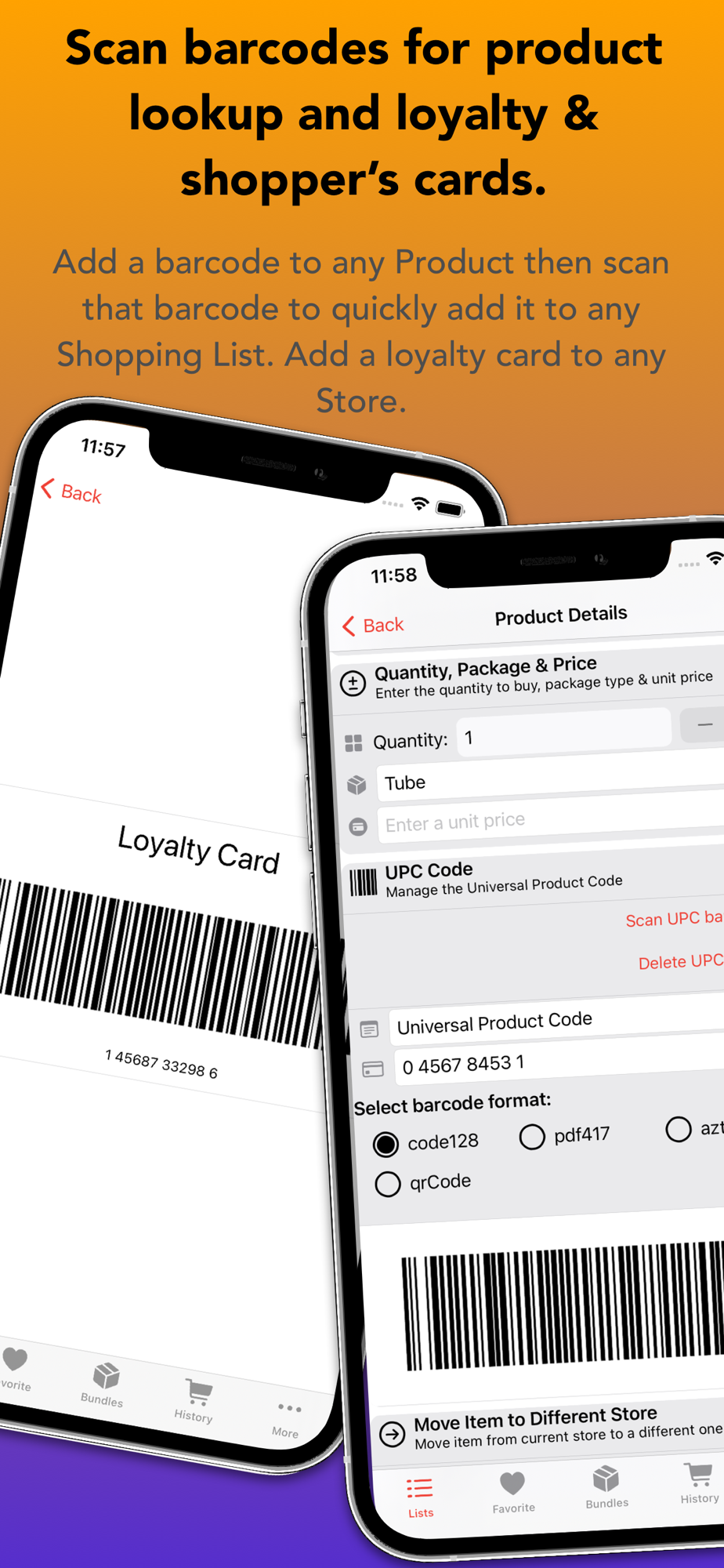 You can attach a barcode to any Products and later scan it to quickly add that item to any Shopping List. Say you just used the last of the ketchup... Grab your iPhone, scan the barcode on the bottle and add it to your grocery list in a snap!