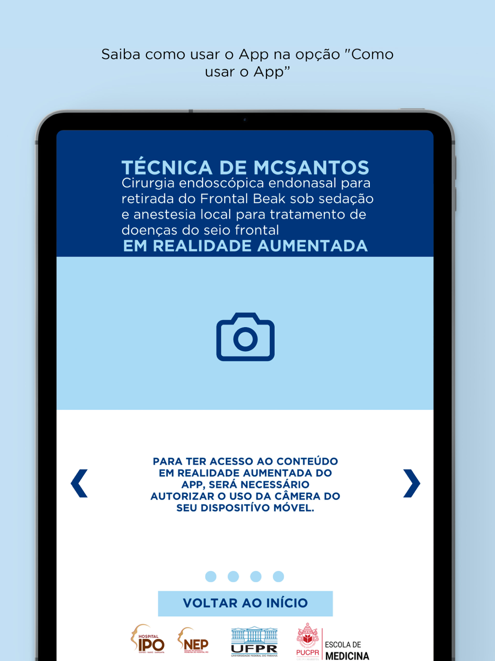 A Realidade Aumentada é uma tecnologia de visualização com câmera, imagem e tracking! A tecnologia consiste em integrar imagens geradas por computador em ambientes físicos em tempo real! Hoje é bastante popular devido a evolução e o fácil acesso a smartphones que contêm câmeras digitas. Ao executar o aplicativo, a câmera do seu celular será ligada. Basta apontar a câmera para as imagens no capítulo dos procedimentos cirúrgicos.