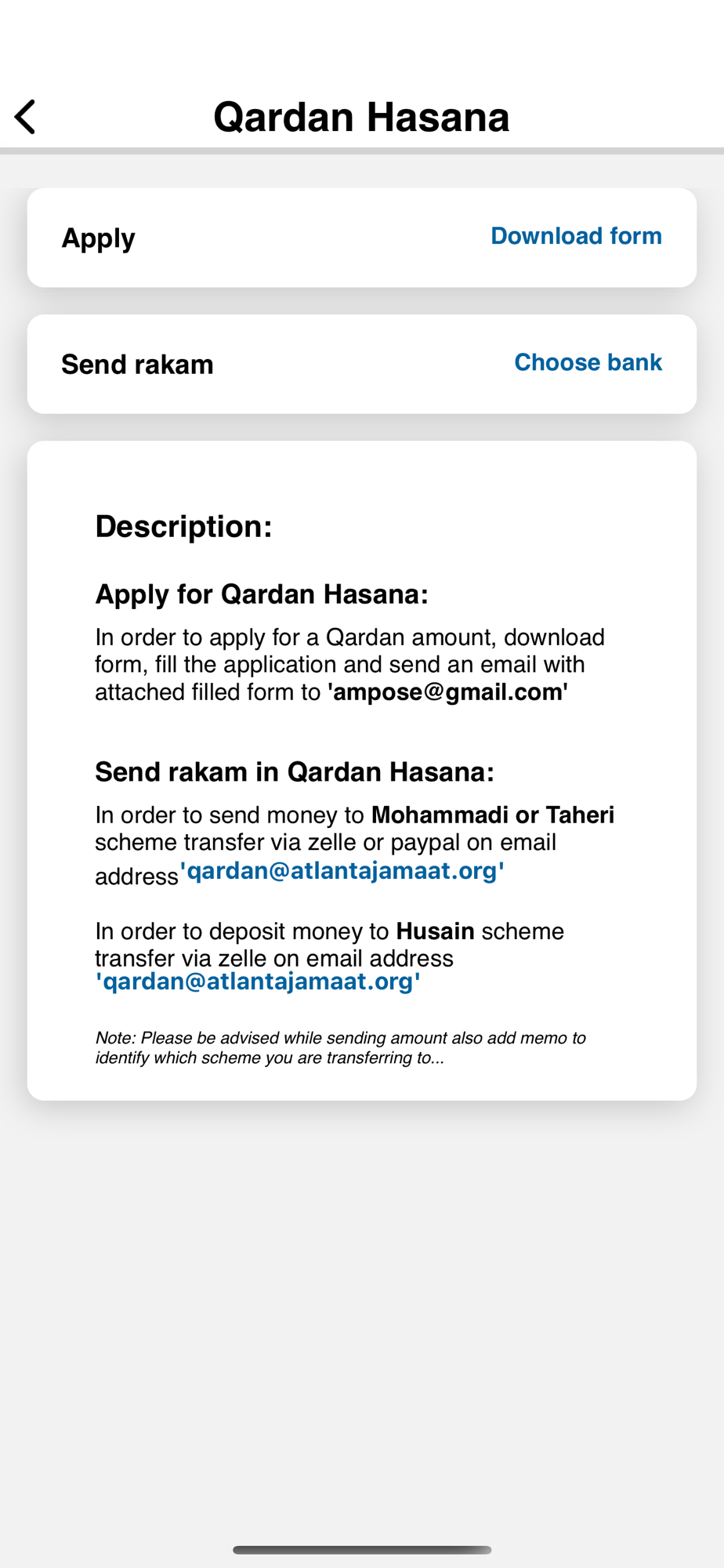 Download the Qardan Hasana form. You can do online transfer to send Qardan amount every Friday or at Miqaats. You can transfer funds through Bank of America, Chase Bank or Wells Fargo Bank.