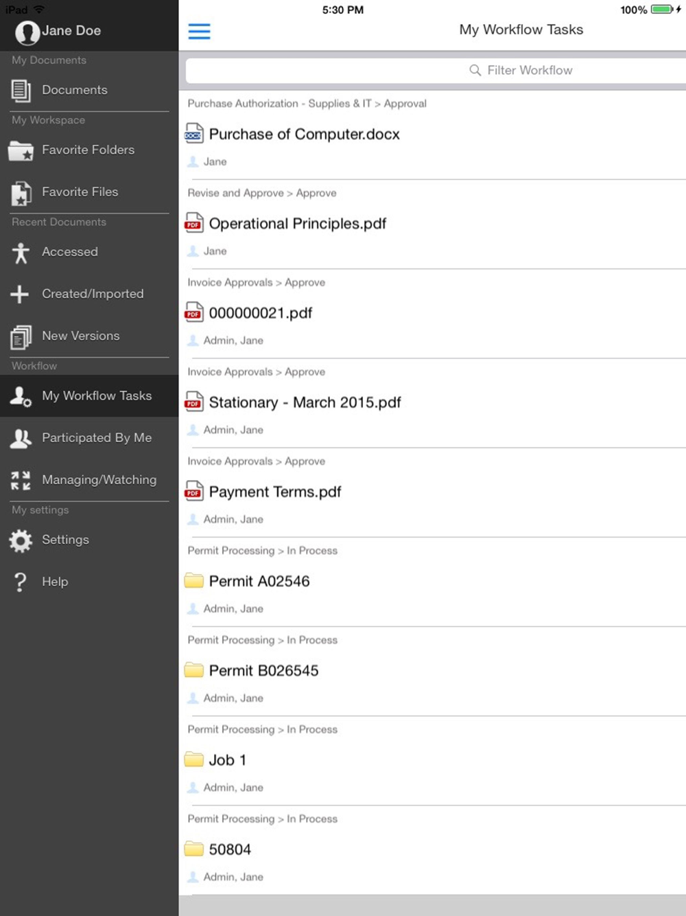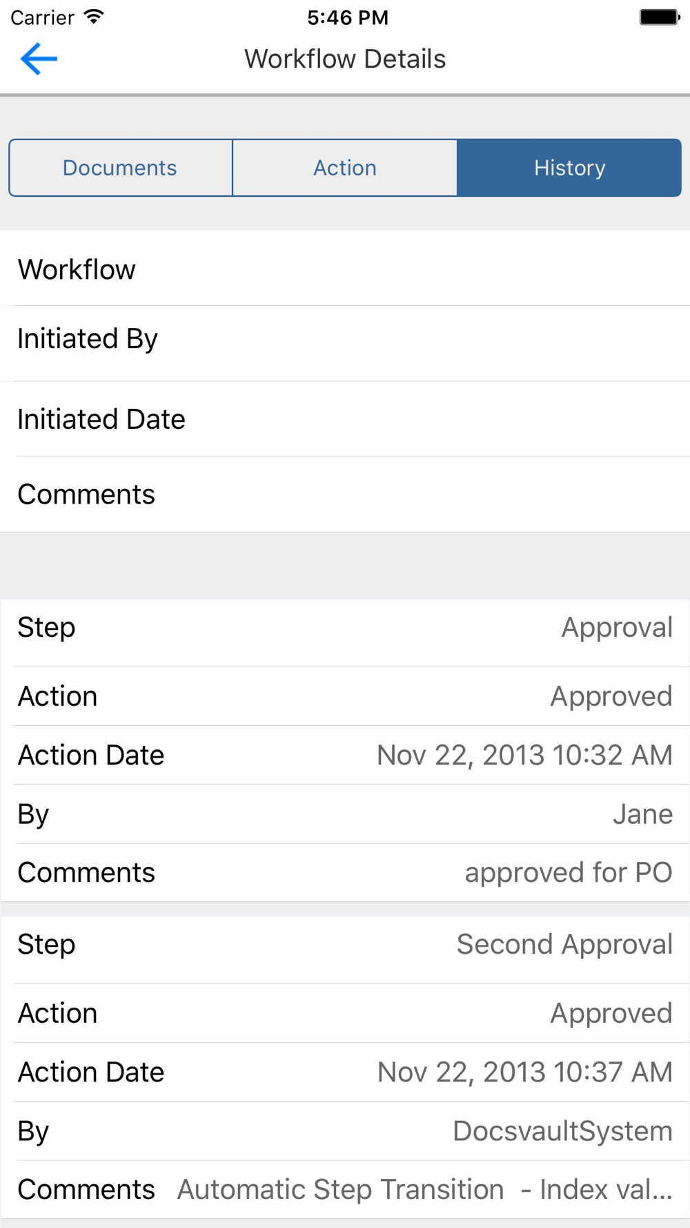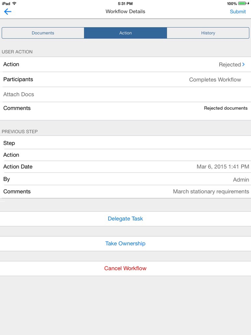 • Access your Docsvault Workflow tasks on your mobile device. Review your tasks, take ownership, delegate or perform required actions on tasks while on the move.