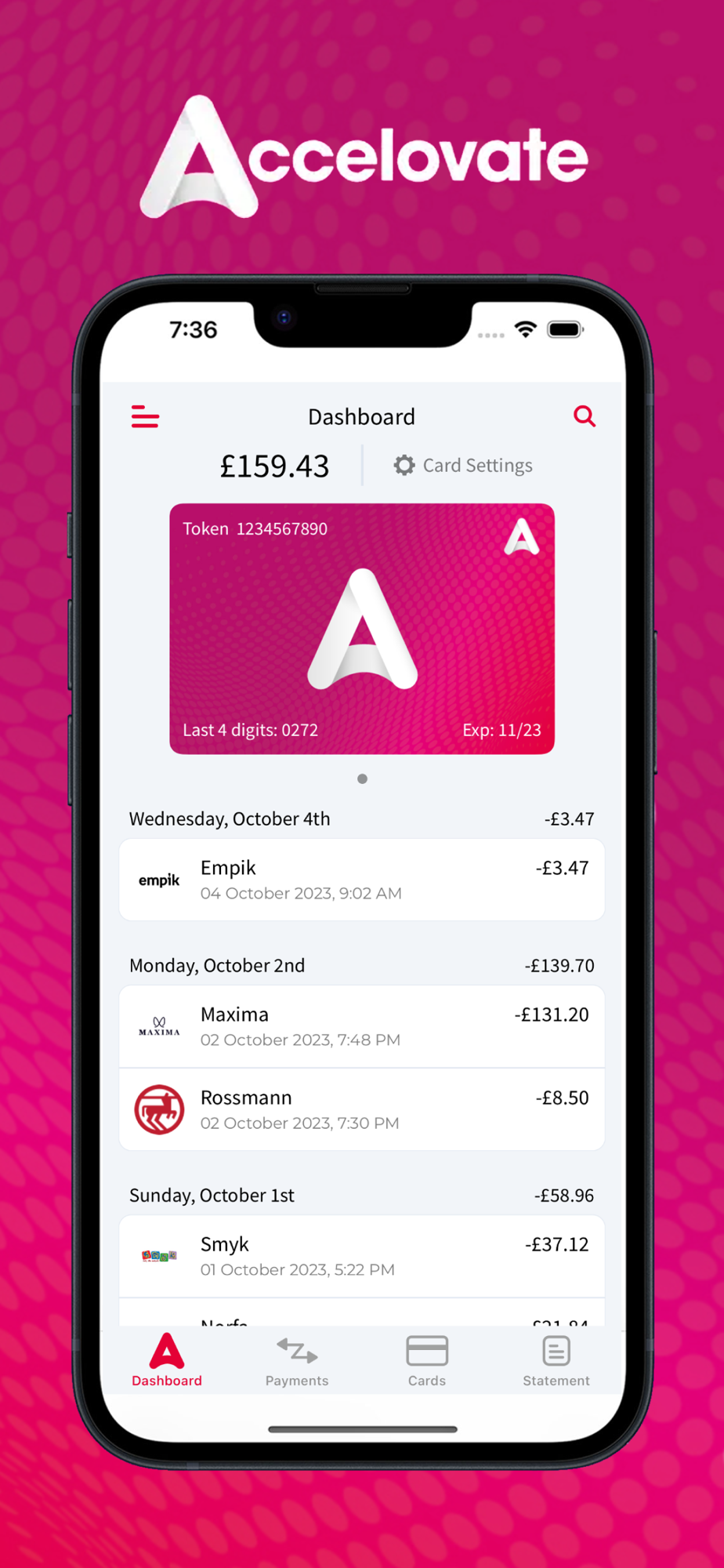 A part of Accelovate/Crunch Payments ecosystem is our dedicated app, which allows Accelovate cardholders to: