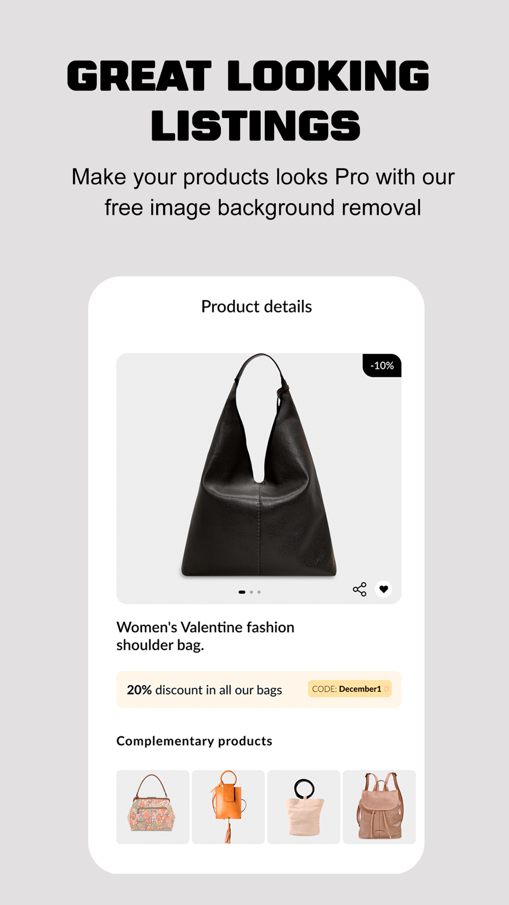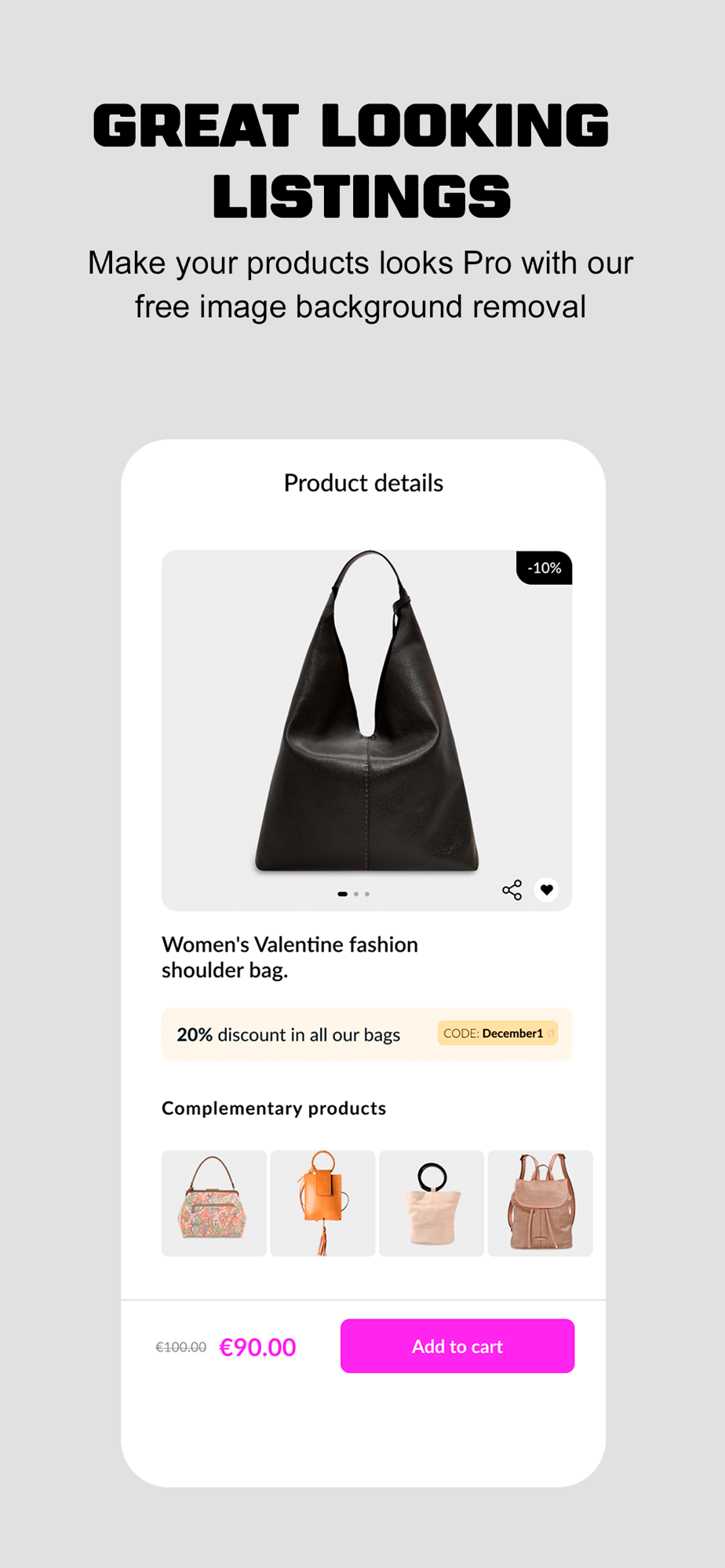 Manage product listing and store categories in a simple and intuitive way. Make your product listing and your online store look more professional with our image background removal feature.