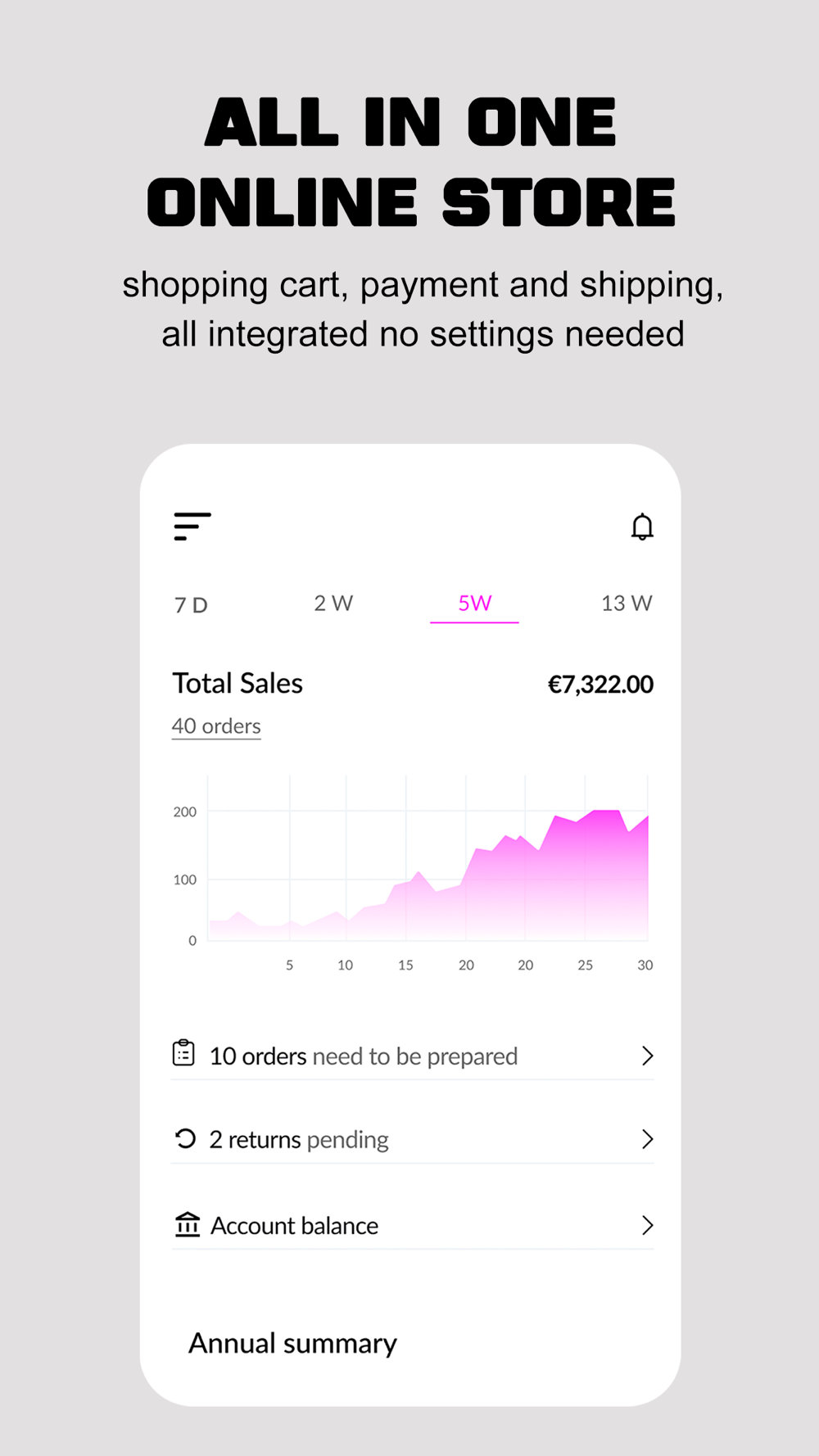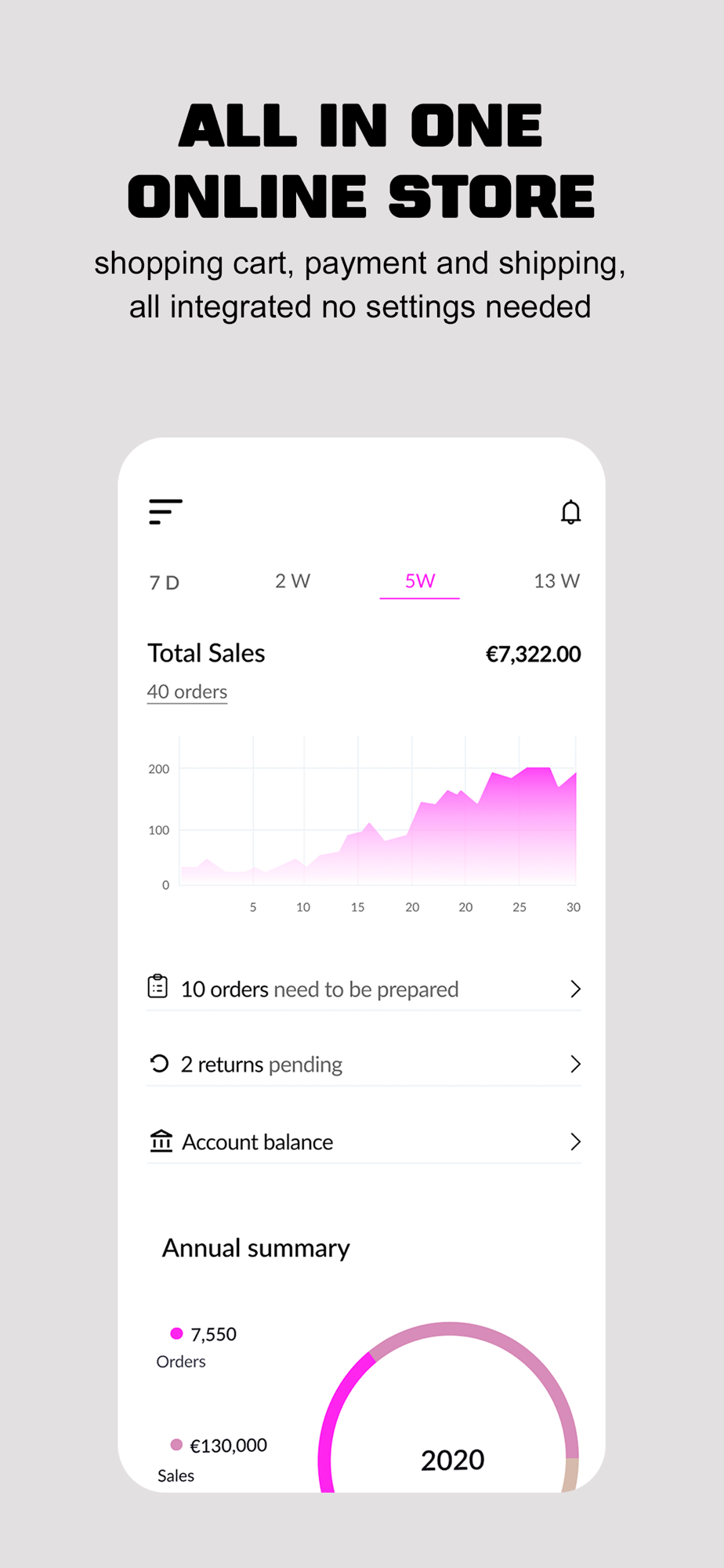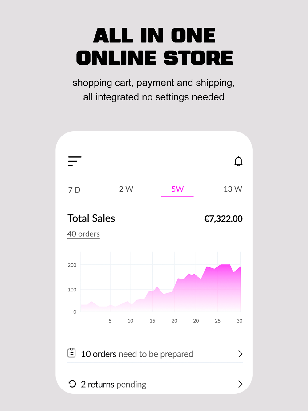 Easily manage orders, inventory and customer returns as well as your online store performance over the course of days, weeks, and months.