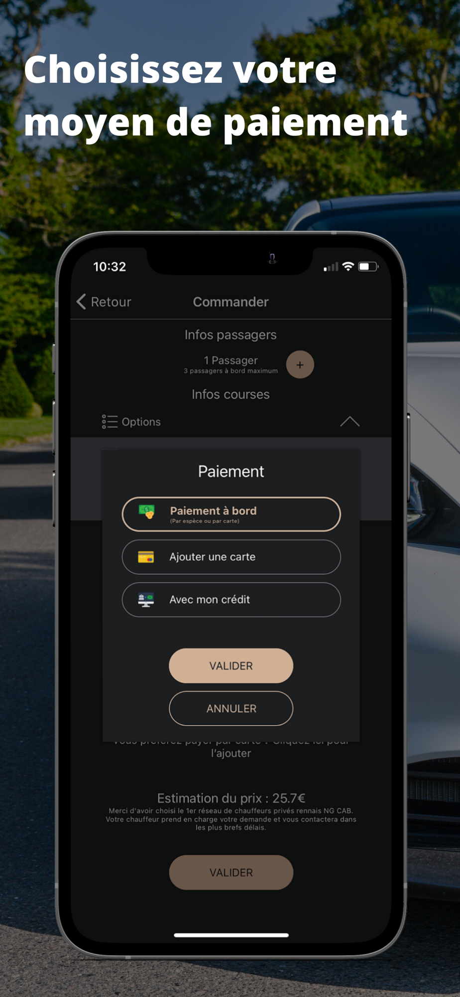 Si vous choisissez de régler votre course à bord, vous pourrez opter pour l’une des options suivantes :
