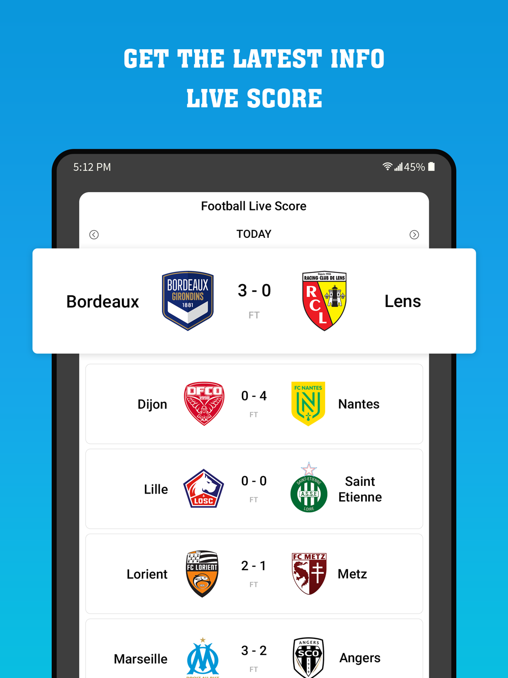 You can get live scores about all the football matches for all the leagues and competitions, including MLS, Premier League, LaLiga, Serie A, Bundesliga, Champions League, and so on.