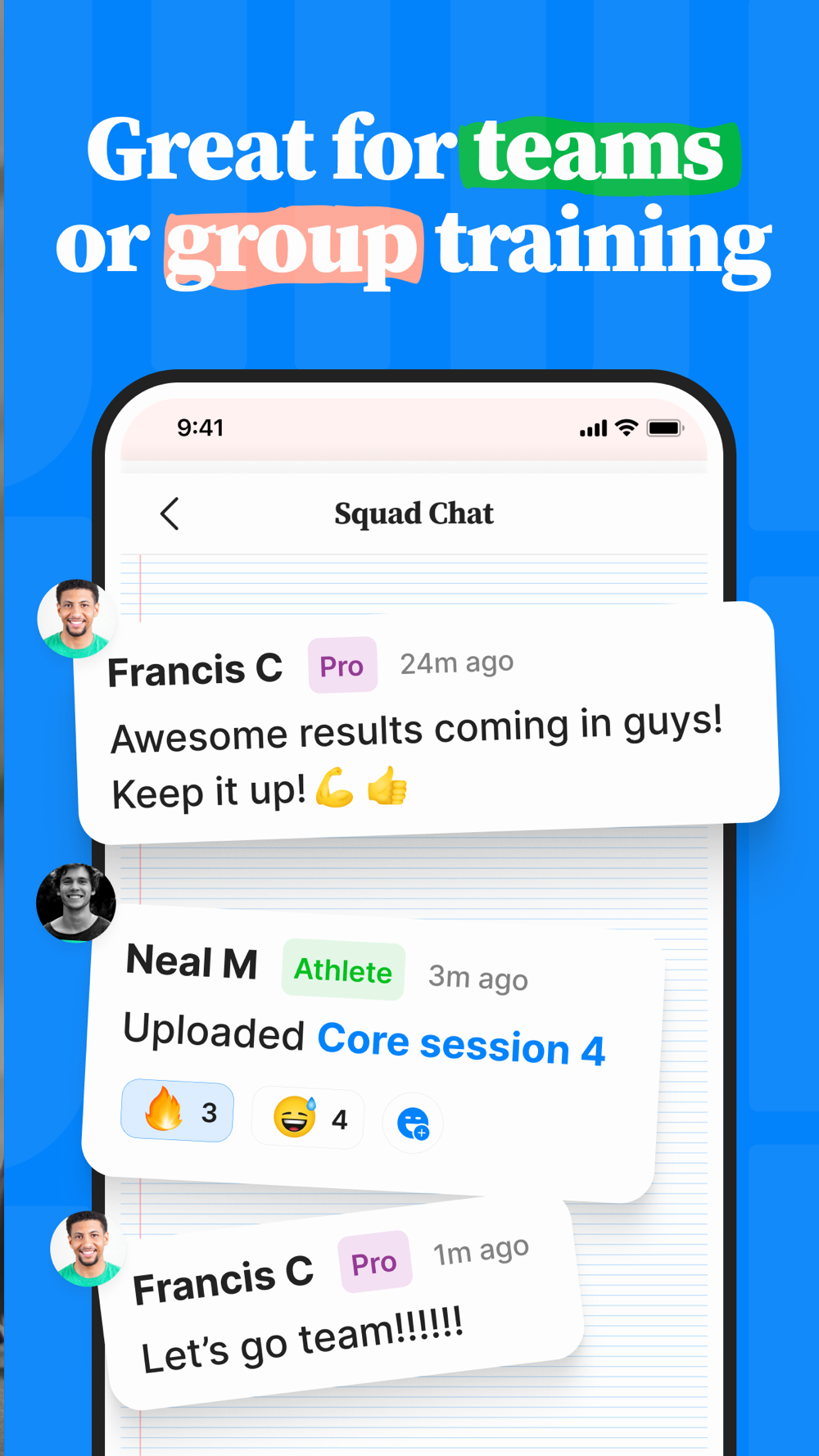 Bring your friends and teammates on your training journey by creating invite-only workout squads or by sharing your training journal. Training squads allow you to share workouts, posts, and chat. Use them for: sports teams (rugby, soccer, lacrosse, rowing, football, swimming, hockey, netball, basketball, etc); groups of friends getting fit for an event (holiday, wedding, summer); workout buddies; gym glasses; small-group PT; fitness events (Hyrox, Functional Fitness, triathlons); forces (Army, Navy, Air Force, Marines, Law Enforcement, Fire); schools, colleges and challenges.