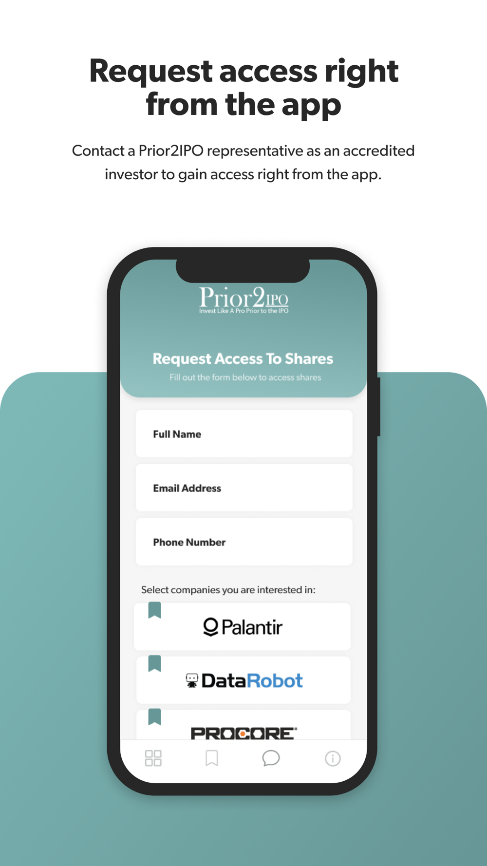 If you are an Accredited Investor, our app offers immediate access to all current available opportunities. You will be connected to an experienced consultant to discuss your access to the secondary market. The Prior2IPO app offers easy and quick reservation of all available opportunities.