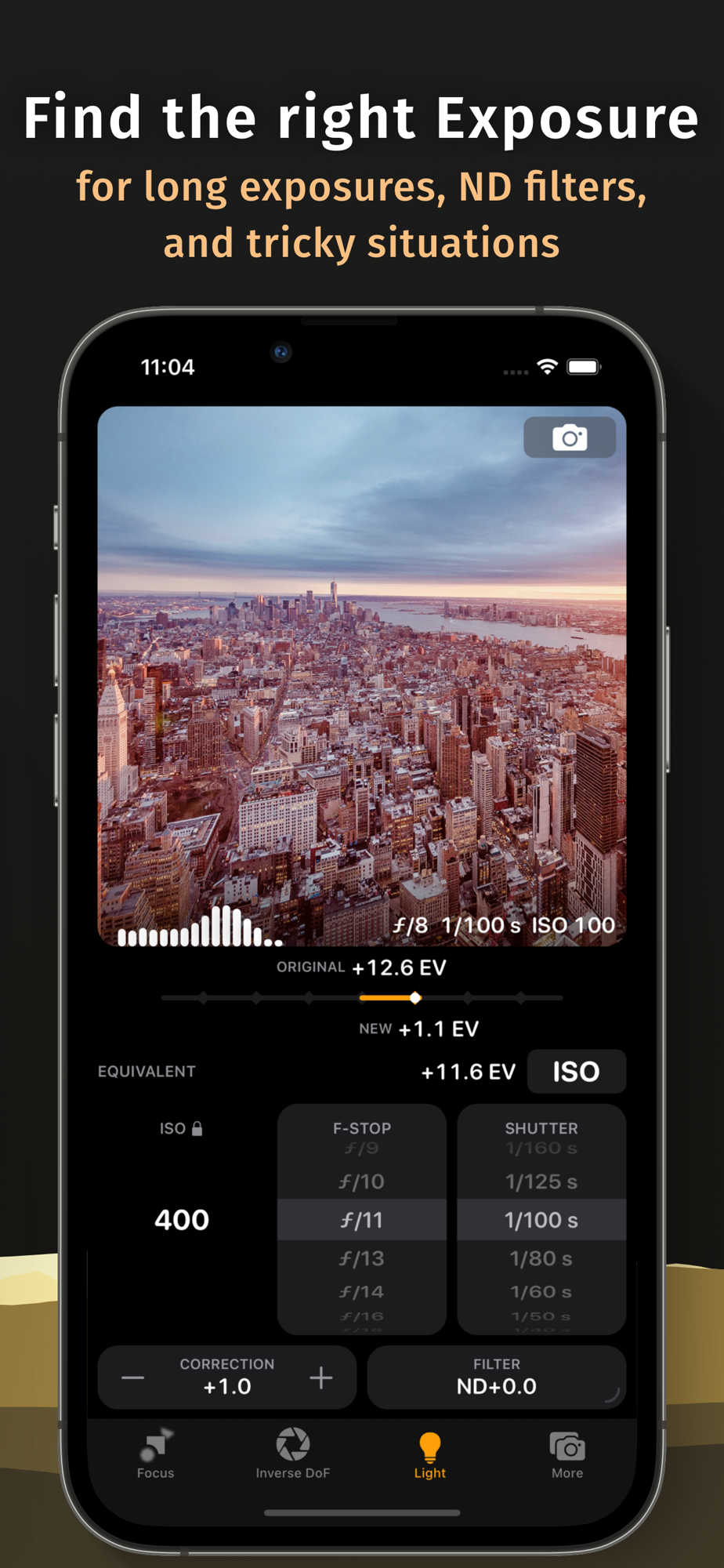 light&depth also includes a light meter and exposure calculator that makes manual exposure simpler than ever before. Find the optimal exposure immediately. Enter custom exposure corrections and ND-Filters. Calculate equivalent exposures, and see how you can adapt your exposure.