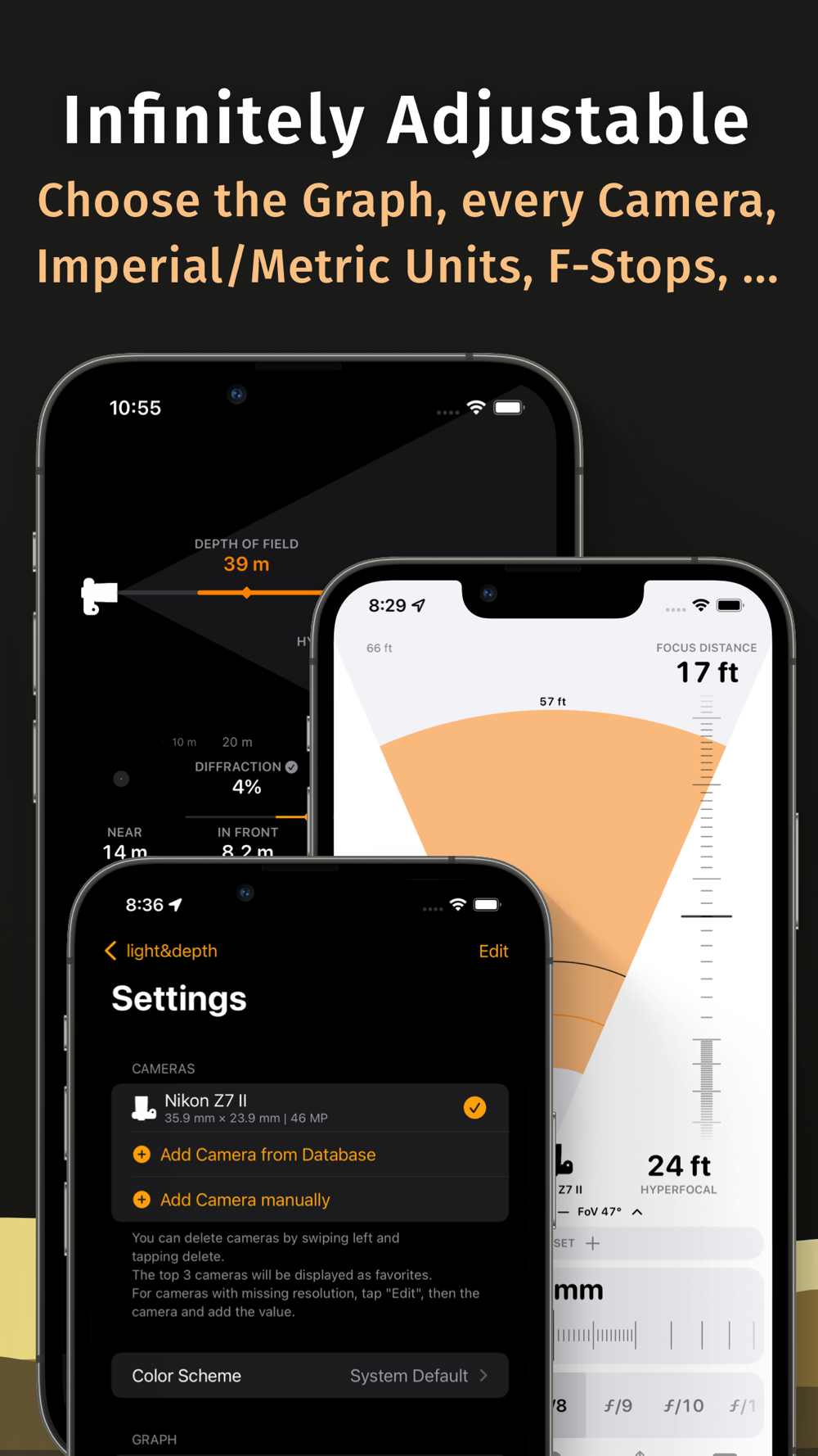 Much of light&depth can be customized to fit your style and equipment. You can customize the interface, and add your own prime lenses and aperture values. We provide a database of over 700 cameras, from classic film large-format cameras to state-of-the-art DSLMs. Should your camera be missing, we will update the database to add it within 48h.