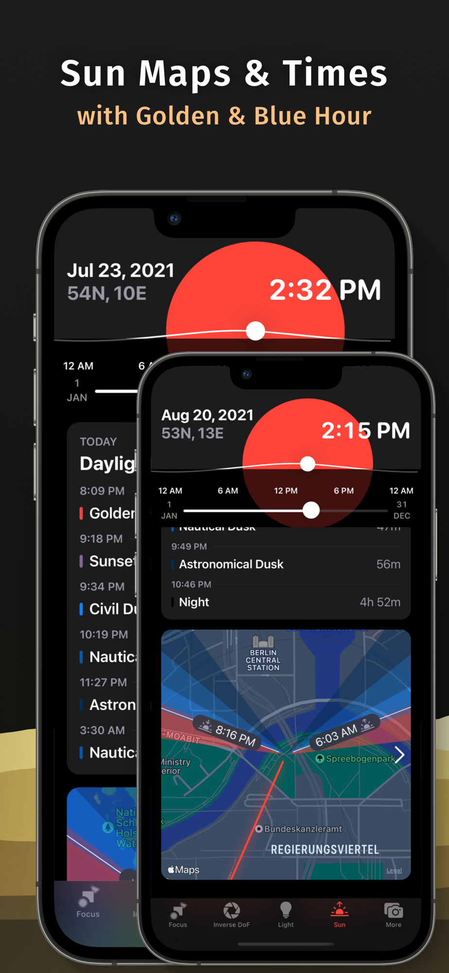 light&depth combines the best depth of field calculator with a fully-featured sun calculator, a light meter, exposure calculator and helpers for every situation. It gives you all the tools you need to supercharge your photography.