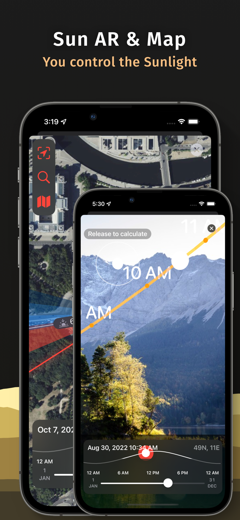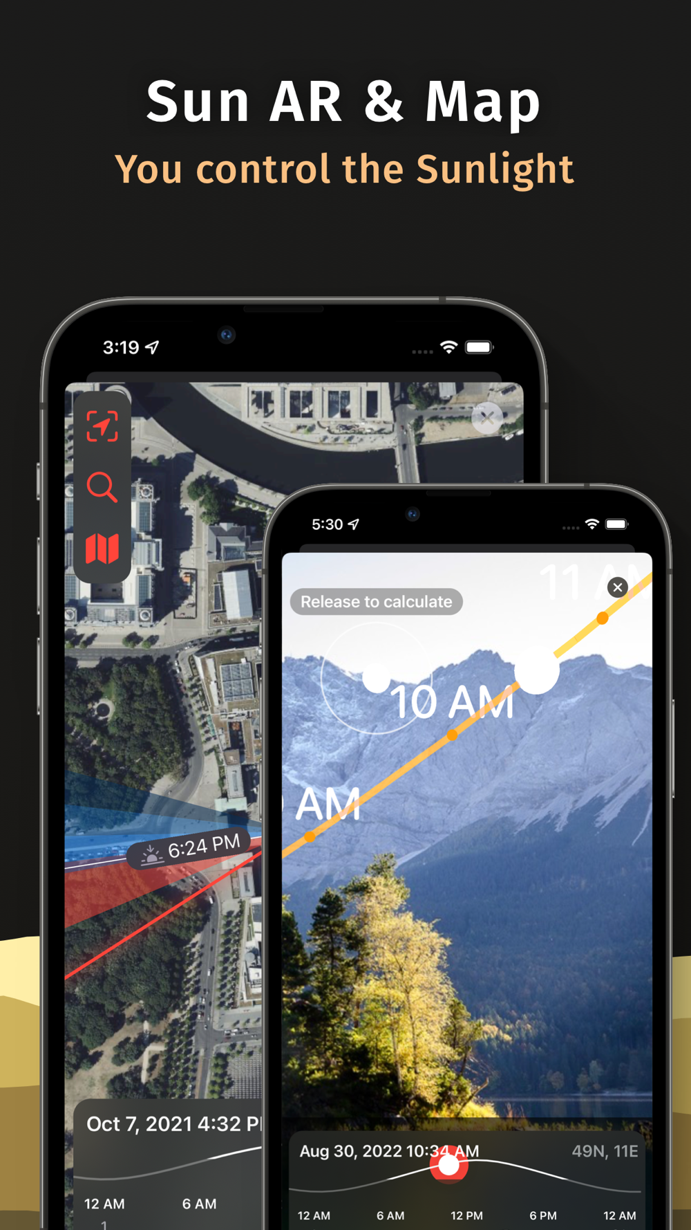 light&depths sun calculations help you with all the information you need about the sun’s location and light. Simply tap right in the AR view to find out when the Sun will hit that perfect spot. Plan ahead by changing the location and time, to find that perfect sunset photo spot. Calculate times for the golden hour, sunset and sunrise, and civil, nautical, and astronomical twilight. See where the sun will shine with beautiful visualizations and map overlays.