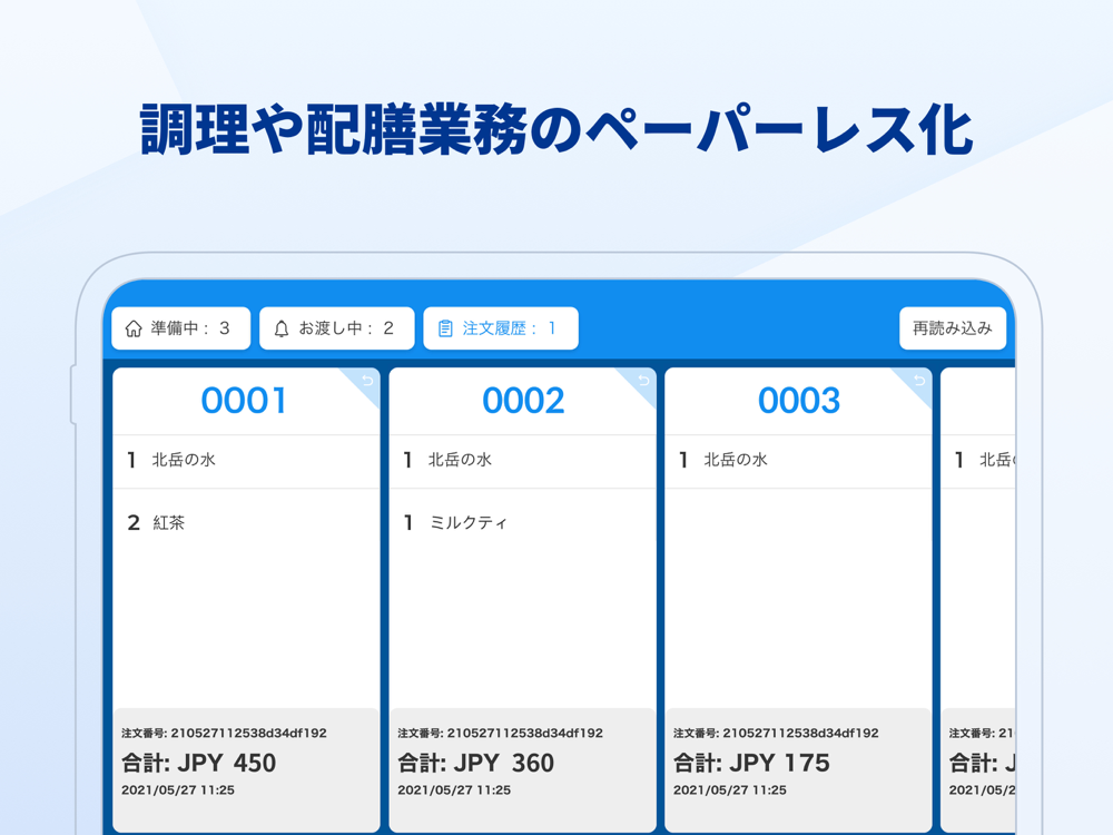 注文順番、準備・受取状況、予約注文の管理などの機能に対応しています。