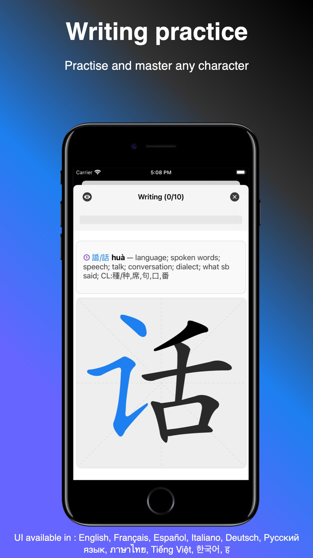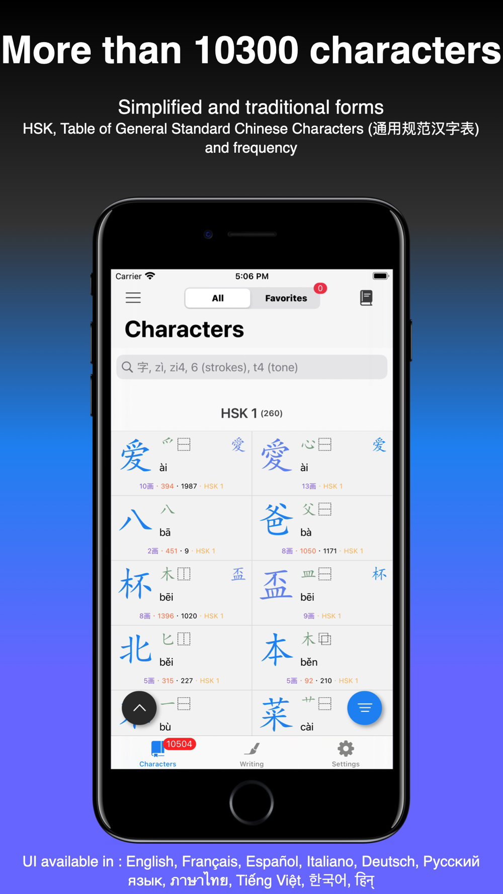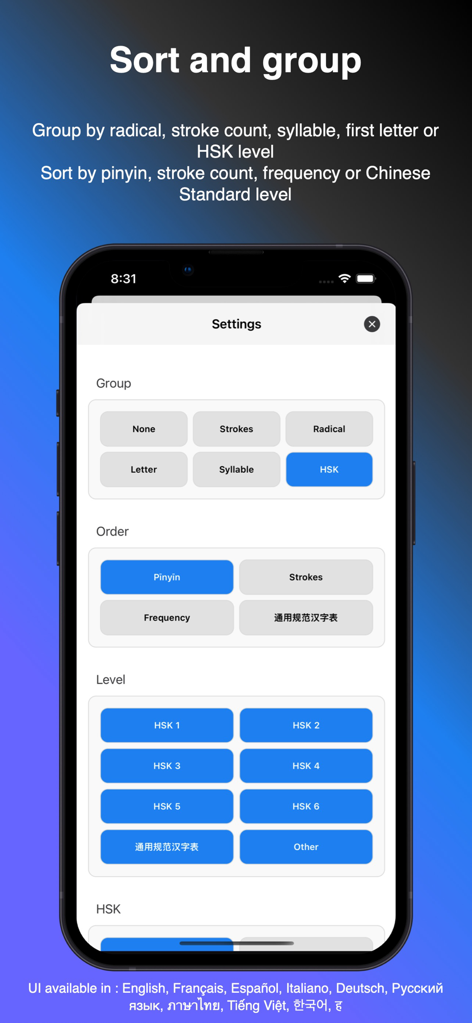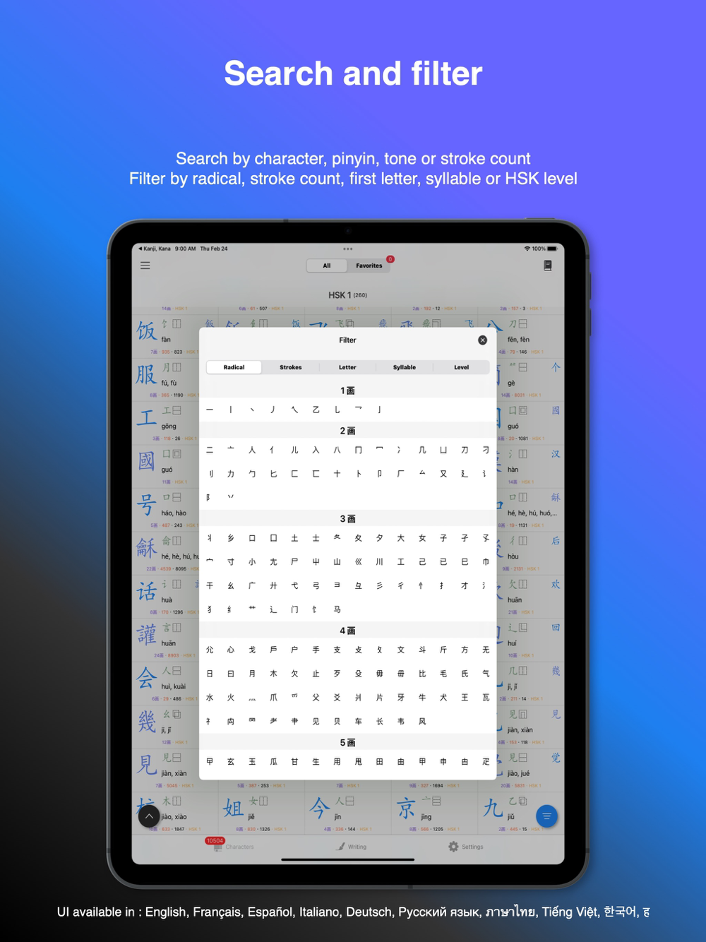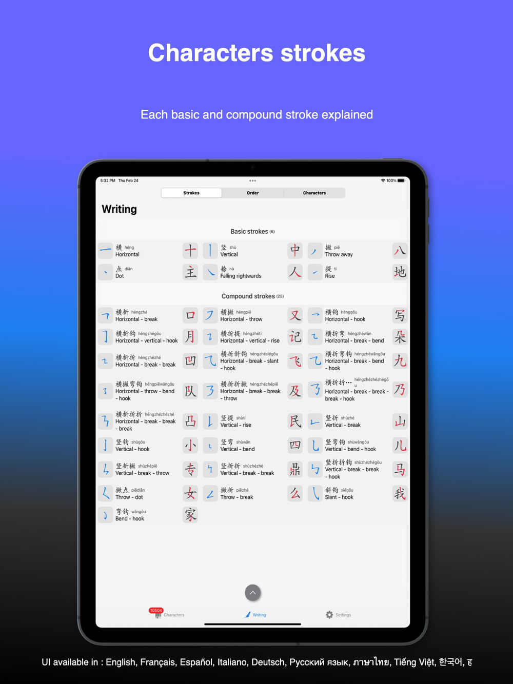 English, Français, Español, Italiano, Deutsch, Русский язык, ภาษาไทย, Tiếng Việt, 한국어, हिन्दी, 汉语, 日本語, العربية