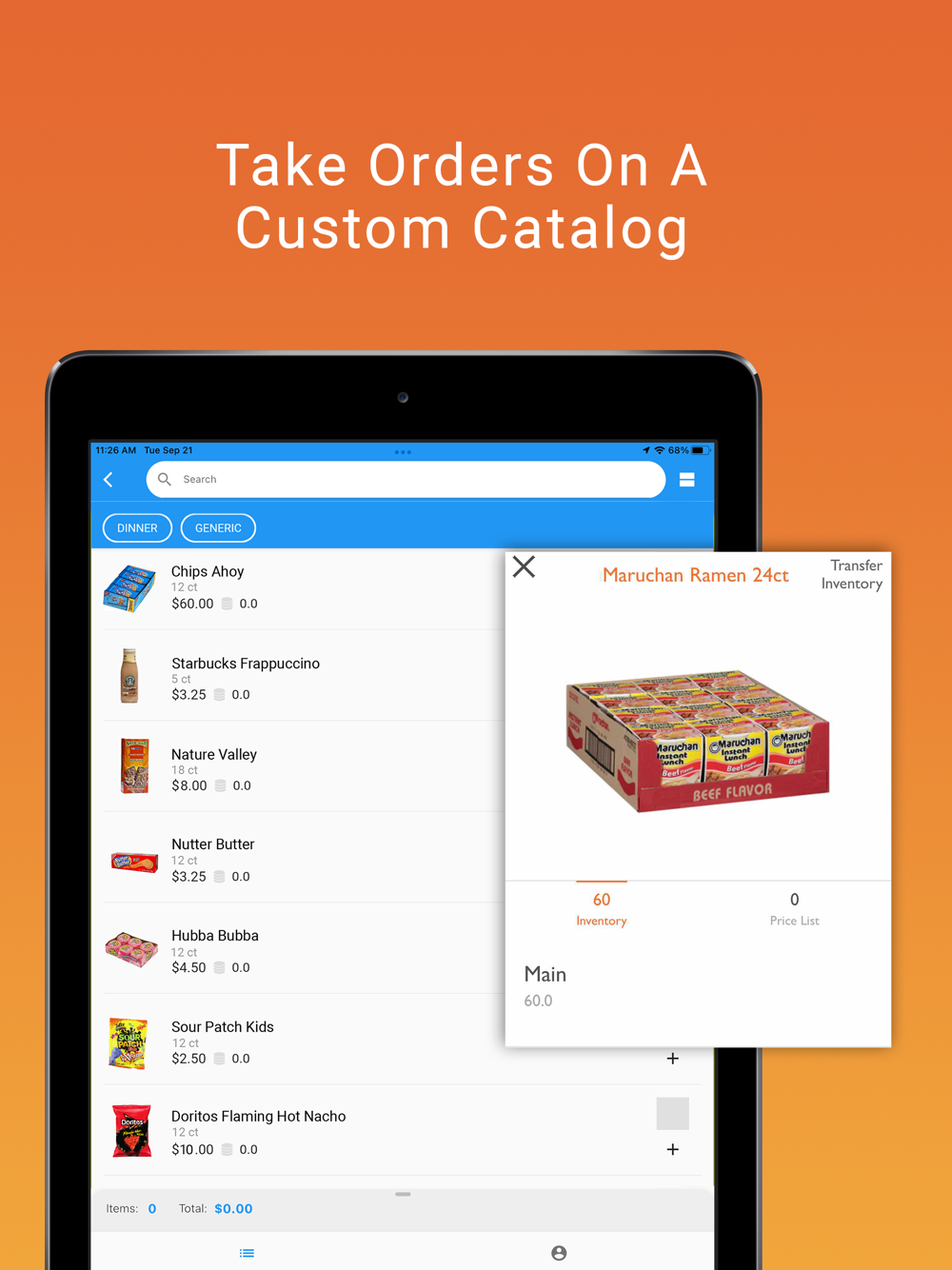 Increase upsell and cross-selling opportunities with the convenience of a digital product catalog with high resolution product images, inventory, pricing, UOM, minimum & case quantity data. Create custom price lists, transfer inventory between warehouses, and generate a PDF catalog for download. Works well at trade shows, warehouses, retail stores - wherever you need to make a sale!