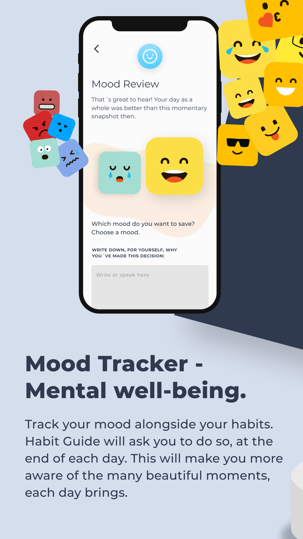 - Mood tracker – Reflection is a skill: By being prompted to think about your mood at the end of each day, you´ll be able to track your moods alongside your habits. This will give you a whole picture of how great you are doing.