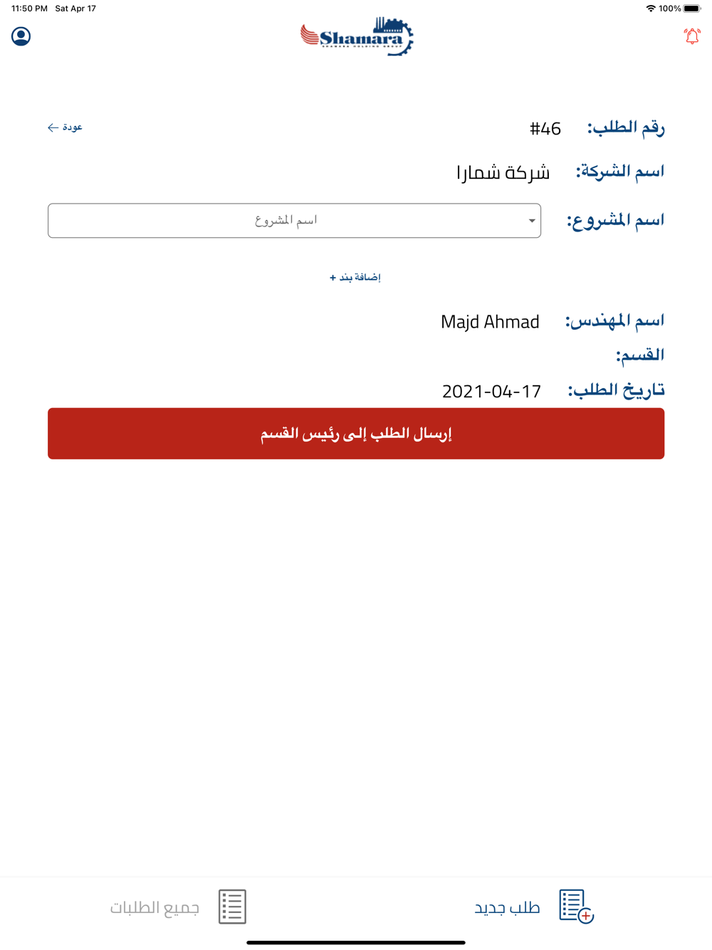 تطبيق شمارا تطبيق الكتروني خاص بشركة شمارا للإنشاءات الذي يسمح للموظفين في هذه الشركة بالقيام بإرسال طلبات الشراء الخاصة بكل مشروع كما يتيح لمدراء الأقسام والمخازن بإدارة جميع العمليات بطريقة سلسلة.