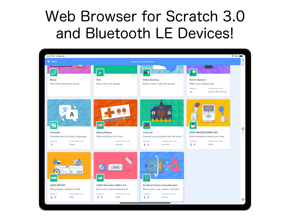 Scrub is a web browser for Scratch 3.0 and Bluetooth LE devices.