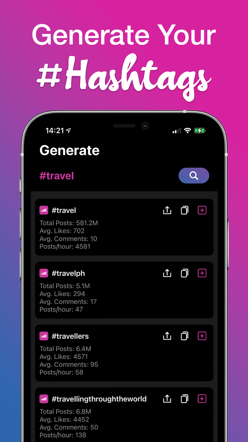 Generate many hashtags for your posts from a single word which will serve as a main subject. For some results you will see a short analysis of its popularity*.