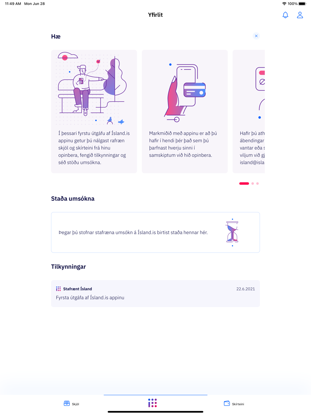 Ísland.is is a centralized portal for public services in Iceland. Here you can access personal information securely and many self-service tools. The site's expanding service offering simplifies the user experience and makes information readily available.