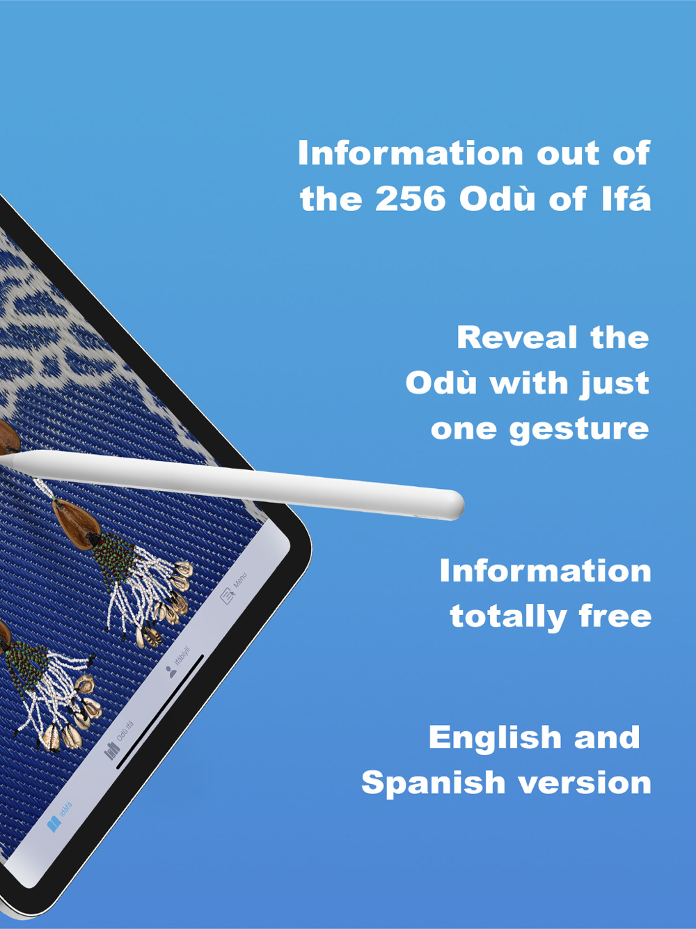 Idàfá contains a summary and interpretation made by Ifábíyìí Akódà of unpublished traditional verses of the 256 signs of Ifá, which in the West is known as "Dice Ifá". It is designed for the uninitiated, those who are beginning their learning or people who want to know in a quick and brief way what the Odù Ifá says, thus complementing the Ojú Odù applications and the Apola series. Idàfá is the first app of its kind in traditional practice, with information provided by authentic Yoruba babalawo.