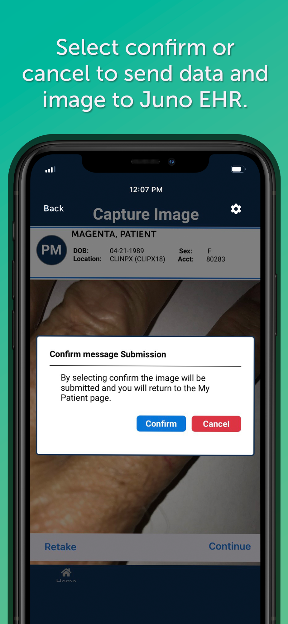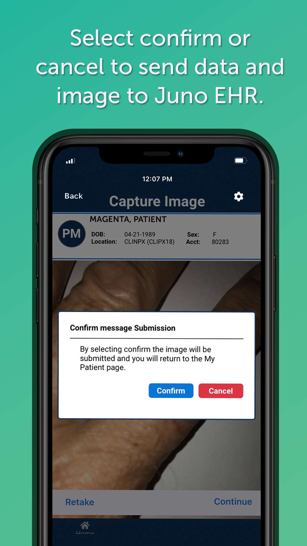Clinical Pictures for iPhone® enables a provider to quickly locate their patient and snap a picture of the patient’s area of care. These photos are securely sent to Juno EHR for further documentation. Clinical Pictures provides the following functions: