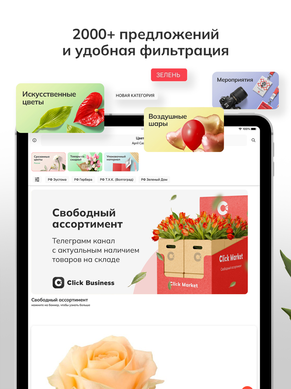 – оптовые продажи становятся максимально простыми и удобными вместе с «Click Business». Одним уведомлением вы можете моментально оповестить всех своих клиентов о выгодном предложении, новом товаре или, например, анонсировать специальные акции и предложения.