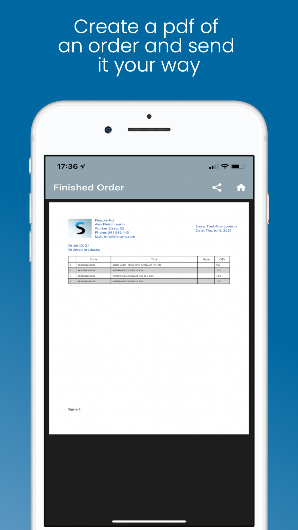 When order is complete, app generates a PDF, XLS and CSV file and you can share it the way you want.
