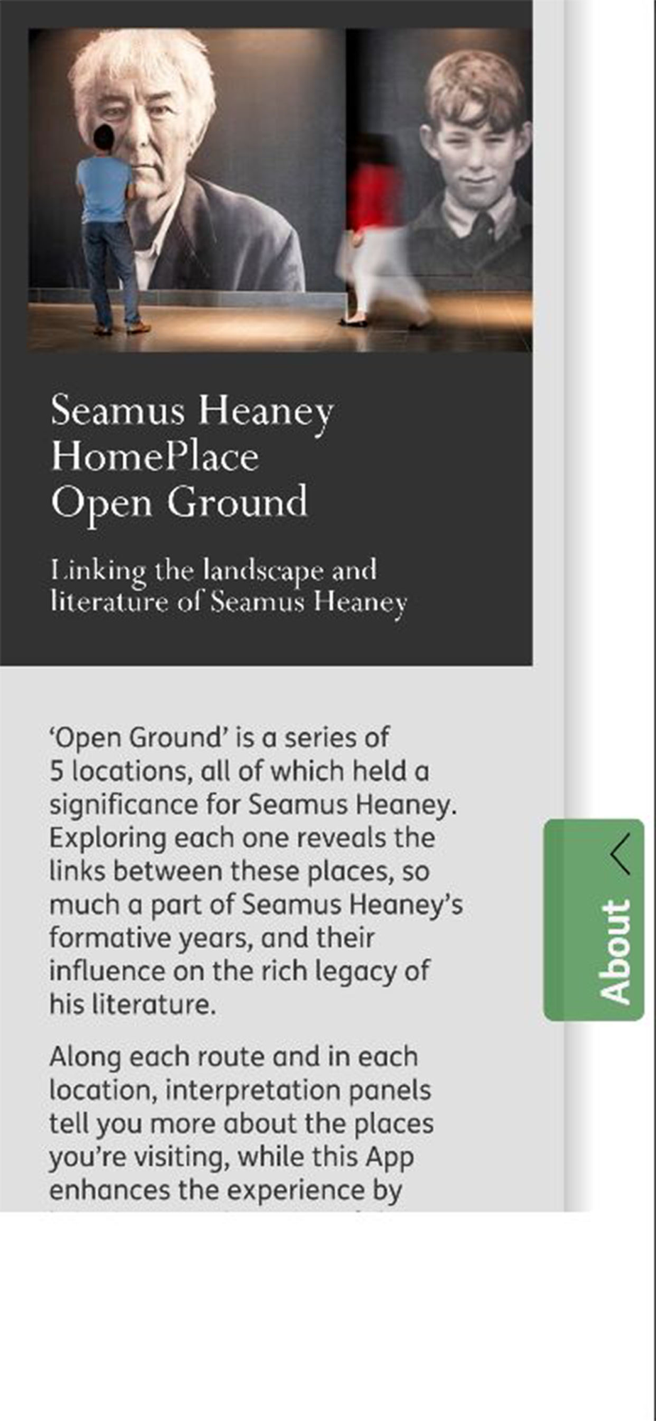 Along each route and in each location, interpretation panels tell you more about the places you’re visiting, while this App enhances the experience by bringing you the voice of the poet reading his own work, and augmented reality brings to life some of the sights and sounds associated with each location.