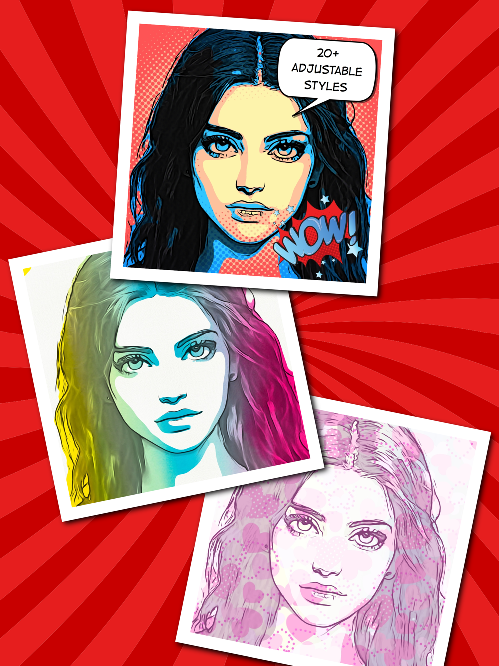 The Stylize stage contains 20+ custom styles that cartoonize or colorize your photo: Cartoon, Smooth, Details, Grayscale, Comic, Hope, Halftone, Money, Grunge, Red, Green, Blue, Graphite, Sketch, Blueprint, Hot 1&2, Funky, Watercolor 1&2, Color Splash 1&2, Seaside, Pastel, and Valentine.