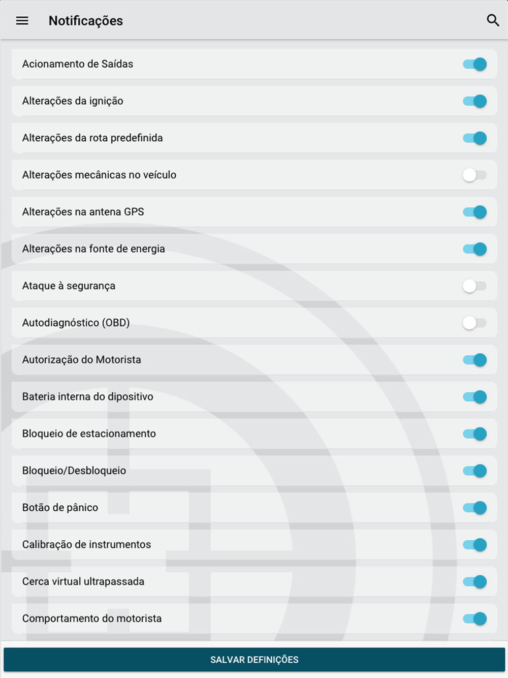 - Notificações push personalizadas, onde o próprio usuário escolhe quais tipos de alerta deseja receber através de push. São 30 categorias de alertas disponíveis ao usuário, dentre eles: alteração de ignição, limite de velocidade violado, ataque a segurança, pânico, entre outros.
