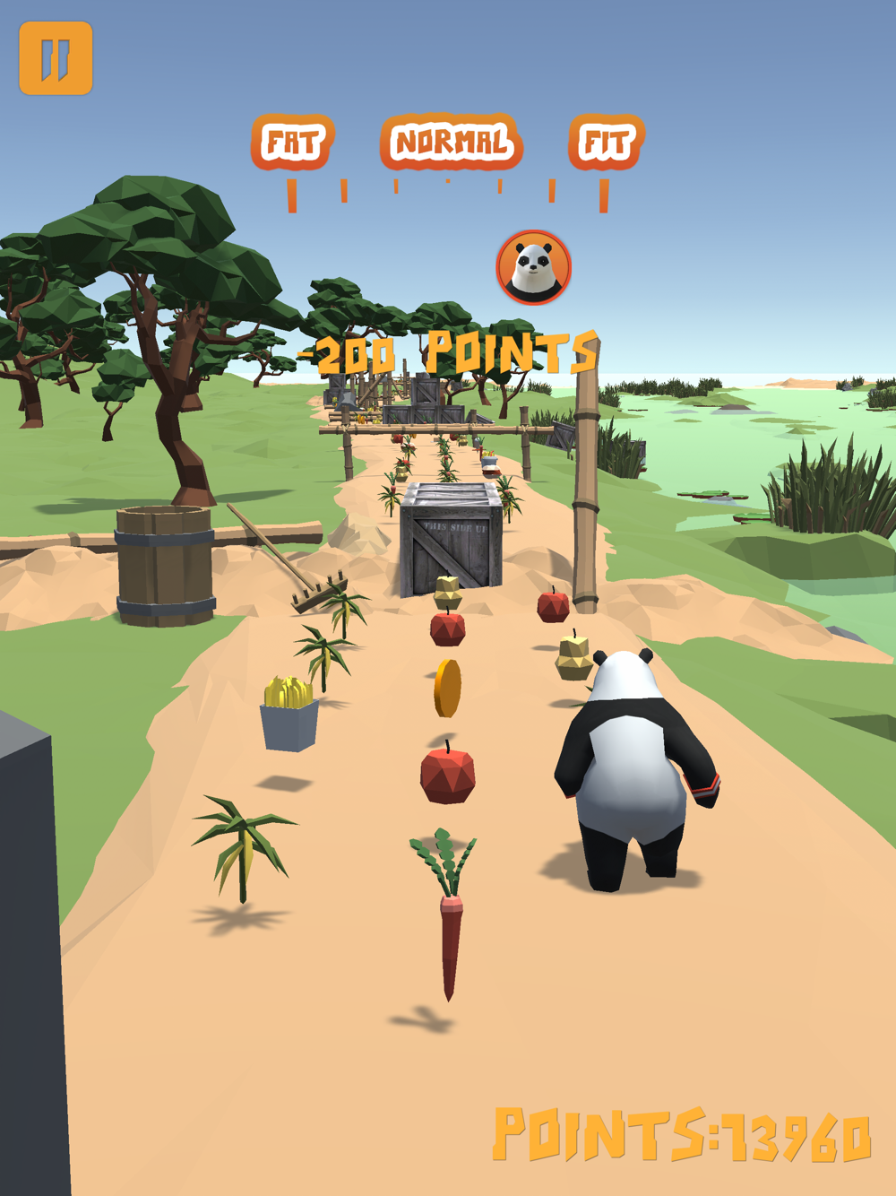 The game features 15 handmade, challenging panda simulator levels and a lot of exciting dash run rewards. You must avoid obstacles, collect coins and eat healthy food at the same time. If you start to eat unhealthy you are getting fat and slow and cannot jump high enough and move fast enough in order to avoid the obstacles. Reach the Goal to pass all levels while staying in shape. The panda adventure run journey starts from an island, moves to bamboo forest, beach, swamps, mountains, desert and many other places and ends in a monastery high in the mountains.