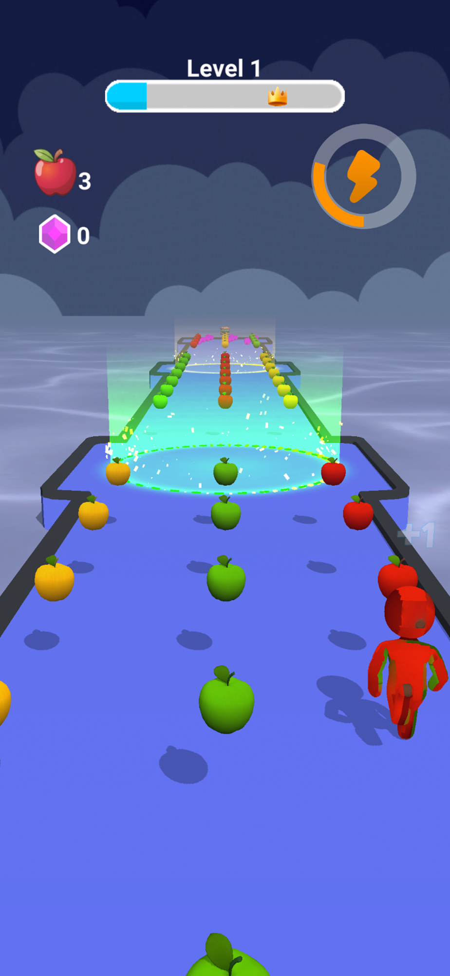 Collect the apples with the color that corresponds with your character. You're trying to get big and health so you can beat up the hamburger at the end of the level and move onto the next.