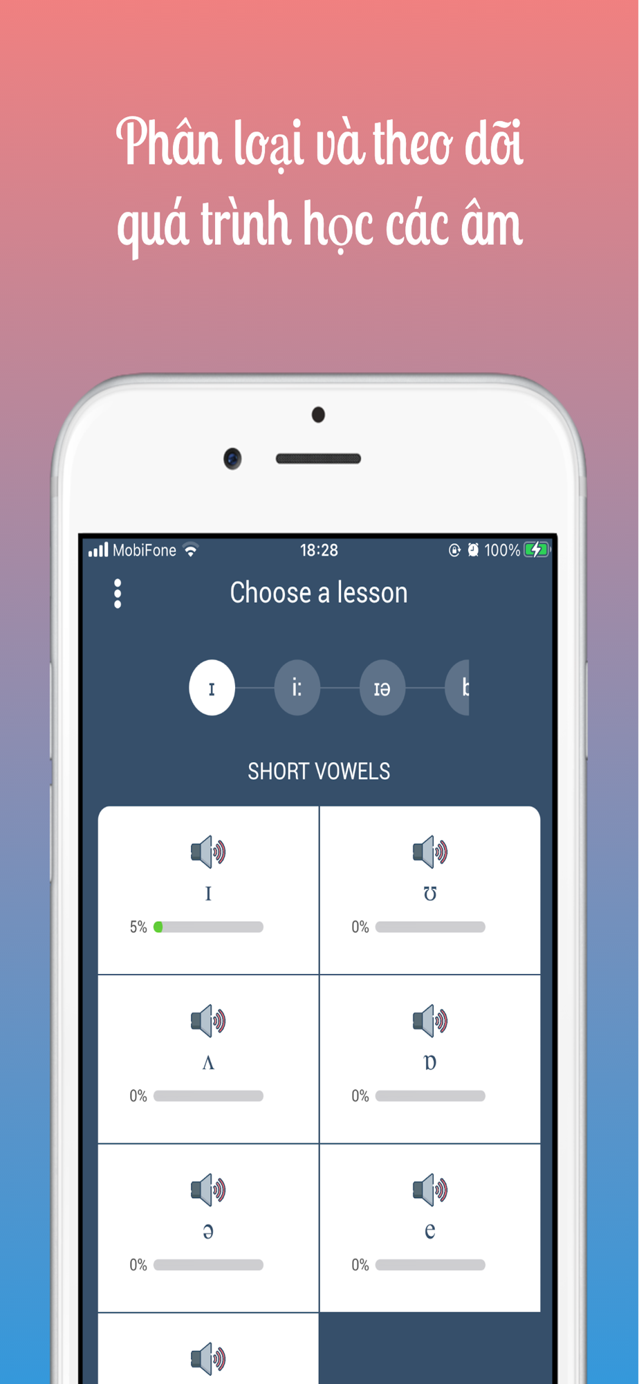 - Theo dõi và thống kê phần trăm đã học theo từng loại âm.