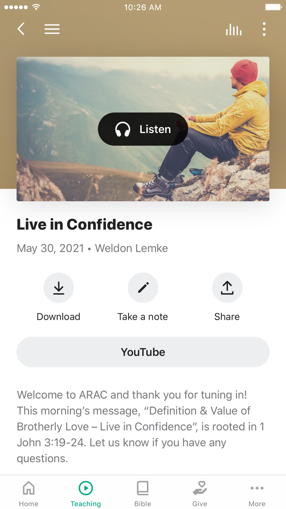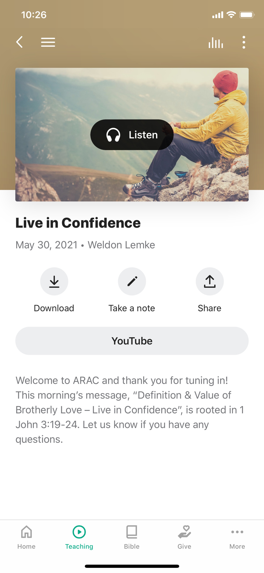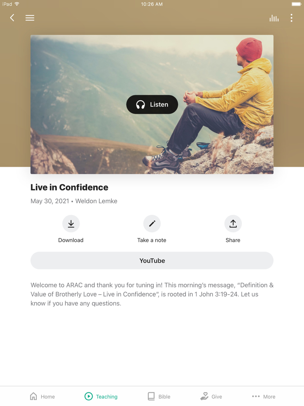This app will help you stay connected with the day-to-day life of Atlanta Road Alliance Church. With this app you can: watch or listen to past messages; stay up to date with push notifications; share your favorite messages via Twitter, Facebook, or email; and download messages for offline listening.